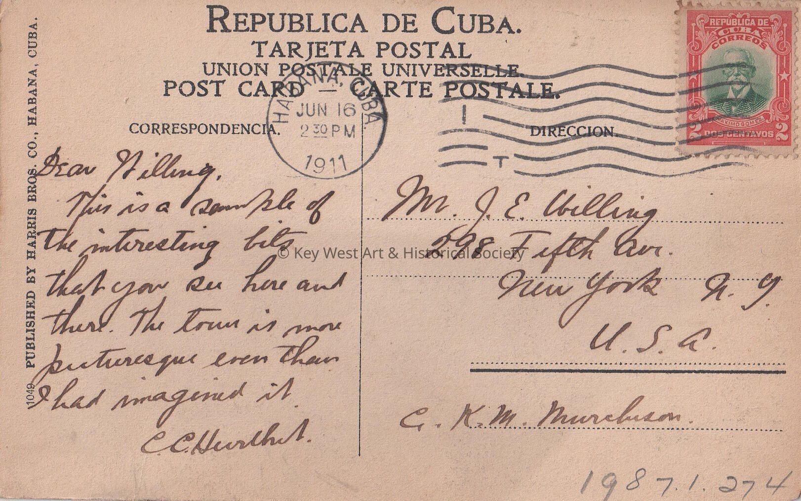 Postcard depicting a tower and buildings. The caption reads, ‘Old Watch Tower, Habana.’ The message on the verso reads, ‘Dear Willing, This is a sample of the interesting bits that you see here and there. The town is more picturesque even than I had imagined it. C. Churchill'. The card is addressed to Mr. J.E. Willing, 298 Fifth Avenue, New York, New York, USA, C.K.M. Murchison, and is postmarked Habana, Cuba, June 16, 1911.Collection