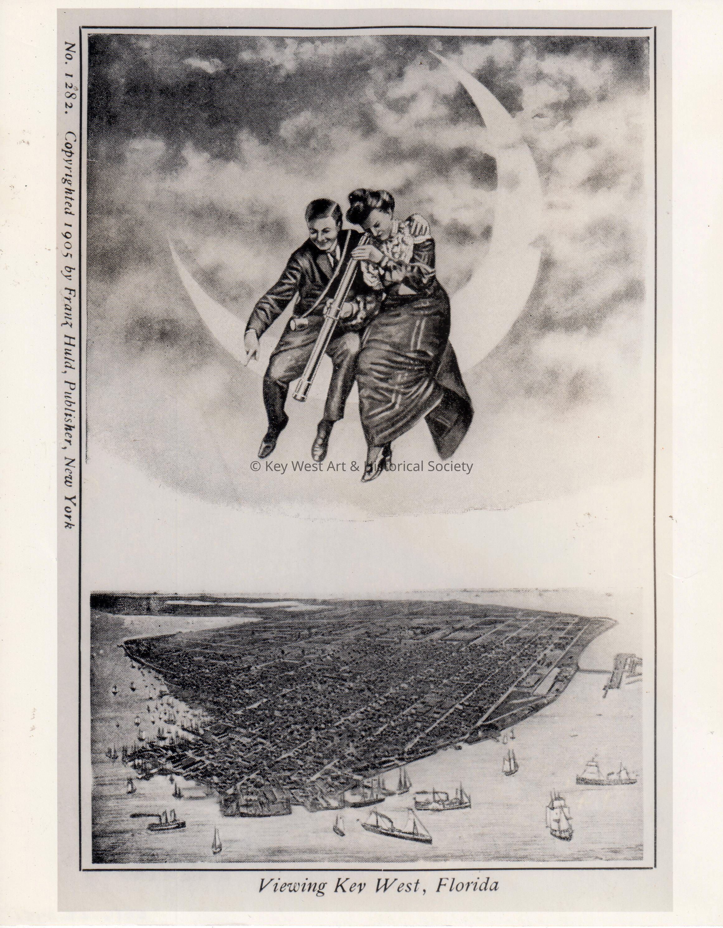 Black and white photograph of a drawing of a couple sat on a crescent moon peering at Key West through a telescope. Key West was taken of the bird's eye view created in 1884.