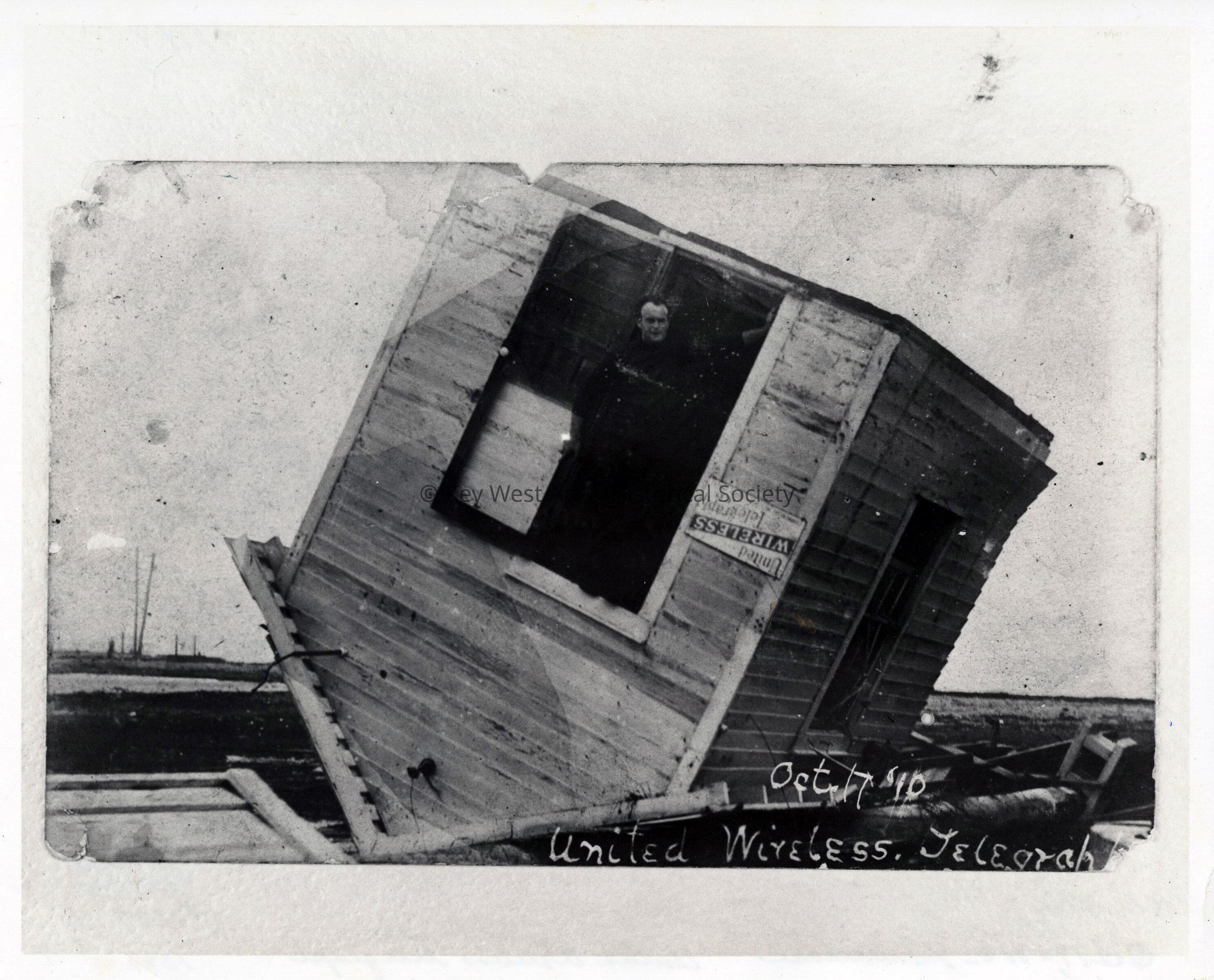 Black and white photograph of the United Wireless Telegraph upended following the Hurricane of 1910.