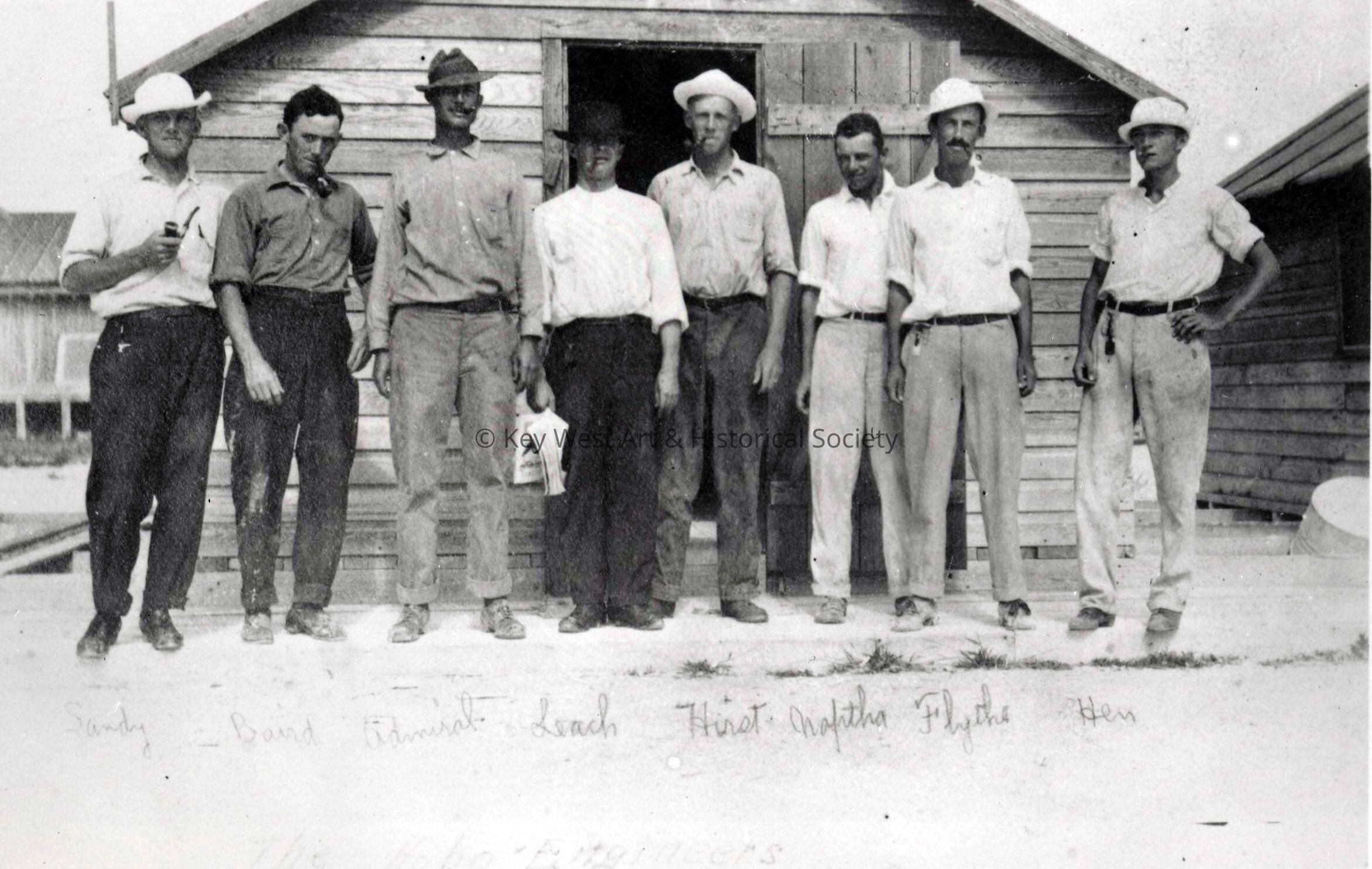 Black and white negative of Florida East Coast Railway construction workers standing in front of a wooden cabin. Names listed as Sandy, Bond, Admiral, Leach, Hirst, Naptha, Flythe and Hen.Photograph Details