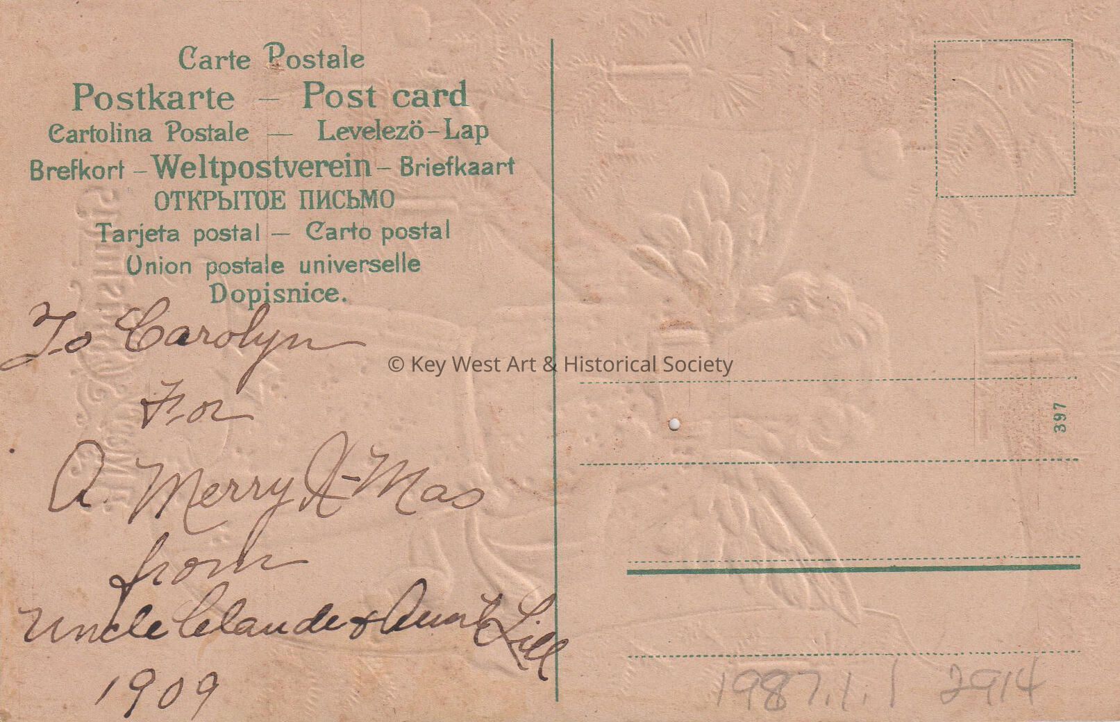 Postcard depicting an angel near a Christmas tree with candles.  The caption reads, ‘A Merry Christmas’.  The message on the verso reads, ‘To Carolyn for a Merry Christmas from Uncle Claude and Aunt Lill, 1909'.Collection