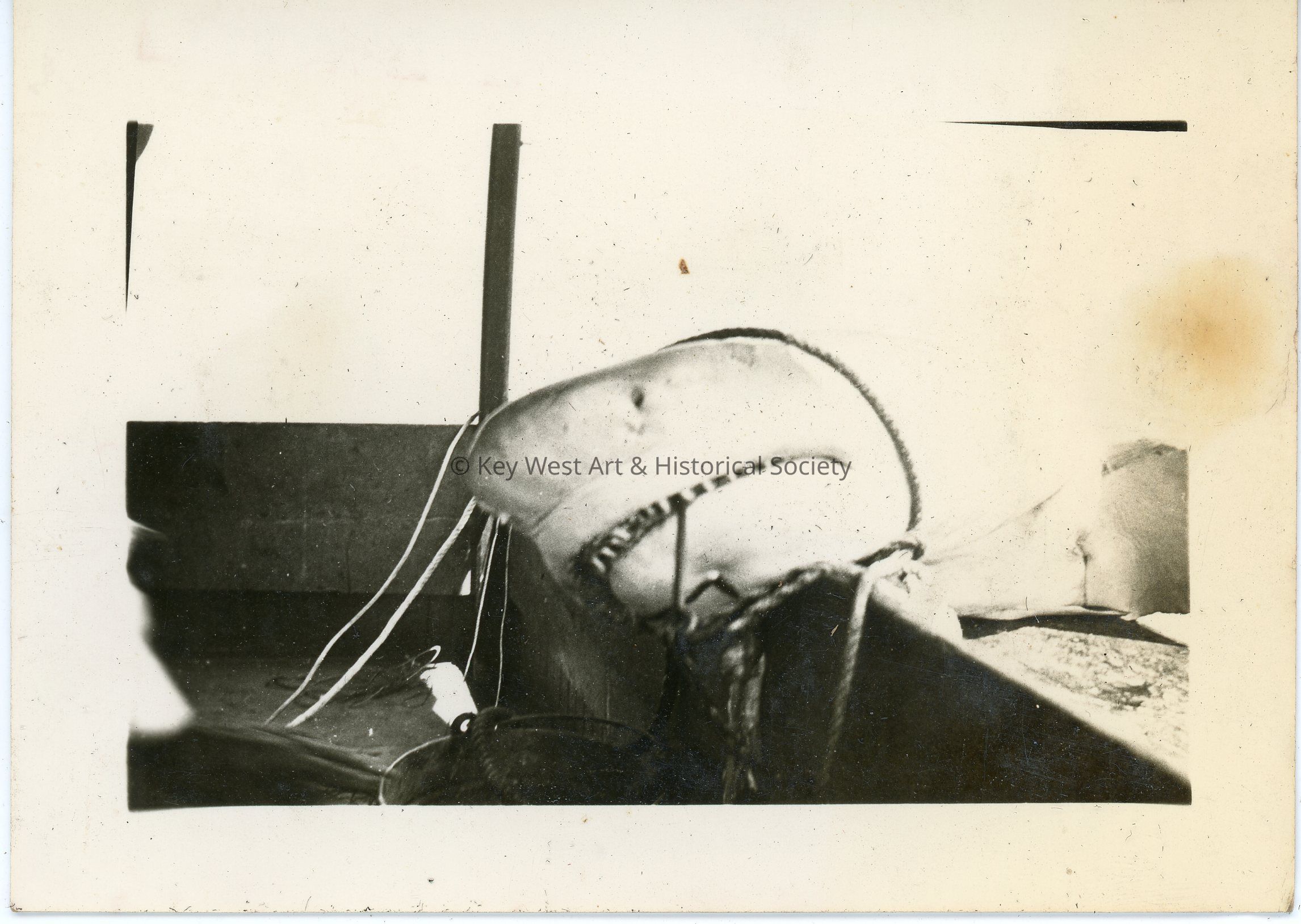Black and white photograph of a large shark that has been caught and pulled out of the water with rope. The photo was part of a photograph album began by Victor H. Baker in 1940.