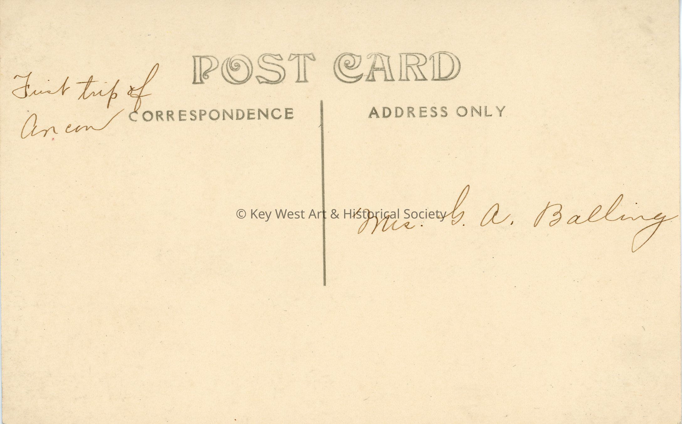 Black and white photograph postcard depicting the ship S.S. Ancon on the Panama Canal. The Ancon was the vessel that made the first official trip through the Panama Canal in 1914. The photograph was likely taken at the Gatun Locks. The postcard is addressed to Mrs. G.A. Balling. Verso has a handwritten note.Subject