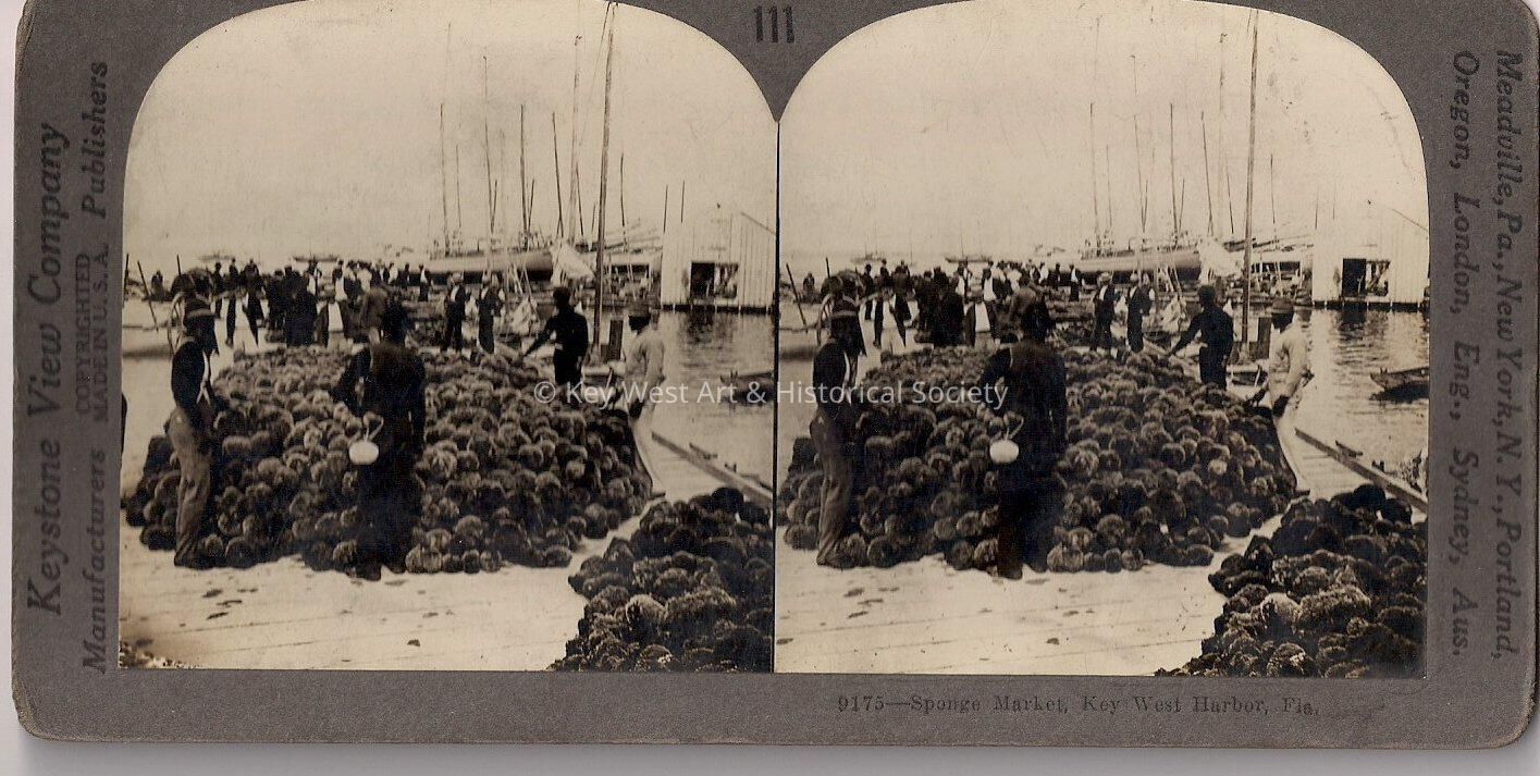 "Sponge Market, Key West Harbor, Fla." Image of sponges poled on the docks. Acession # 2008.36.0004.