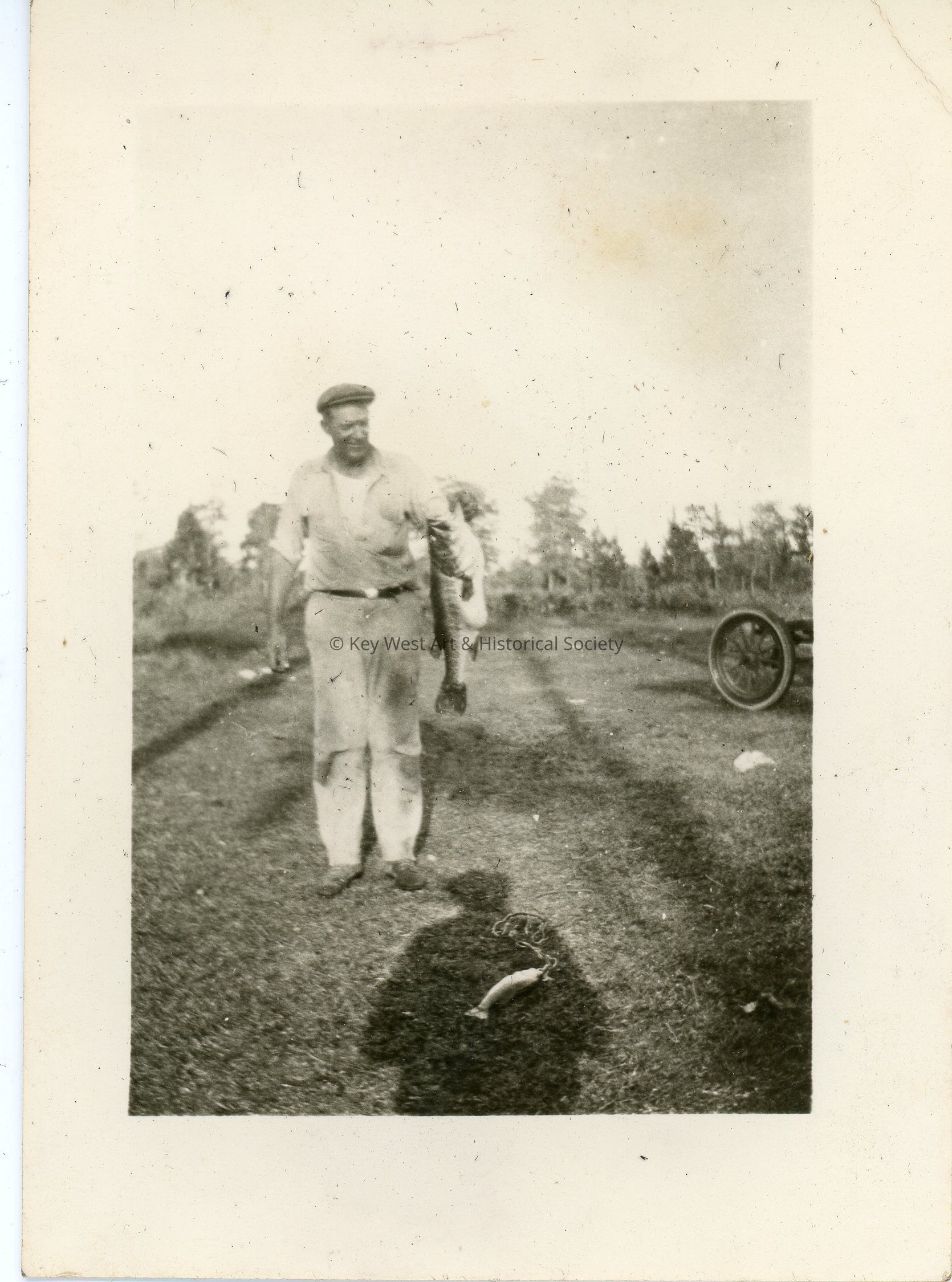 Black and white photograph of a man holding up a fish with a second fish on the ground before him. The shadow of the photographer is in the foreground. The photo was part of a photograph album began by Victor H. Baker in 1940.