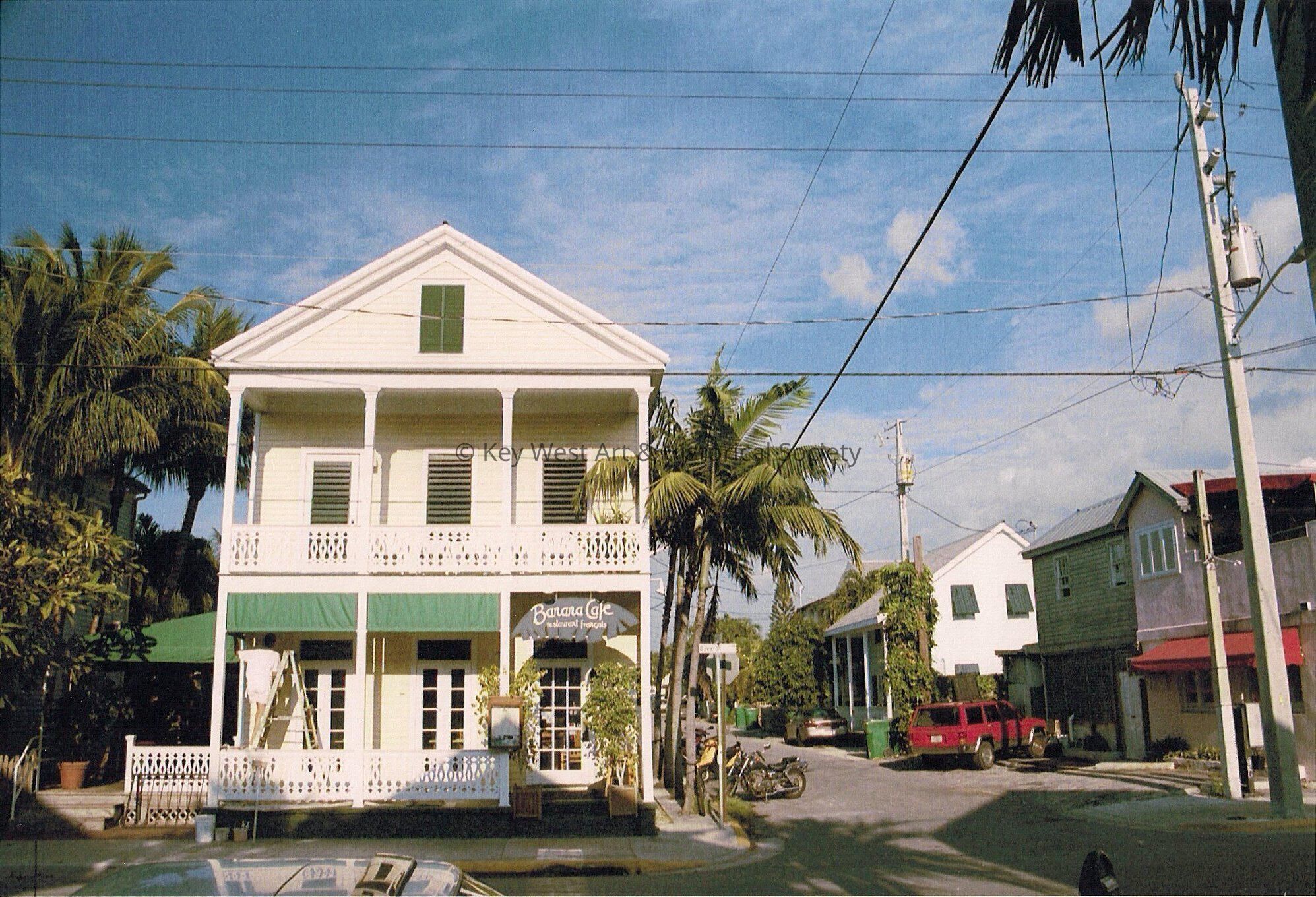 Colored digital copy of a 2 story wood building on the corner of Duval and Louisa. Photo is part of a 'Then and Now' series. Older photo #2681.