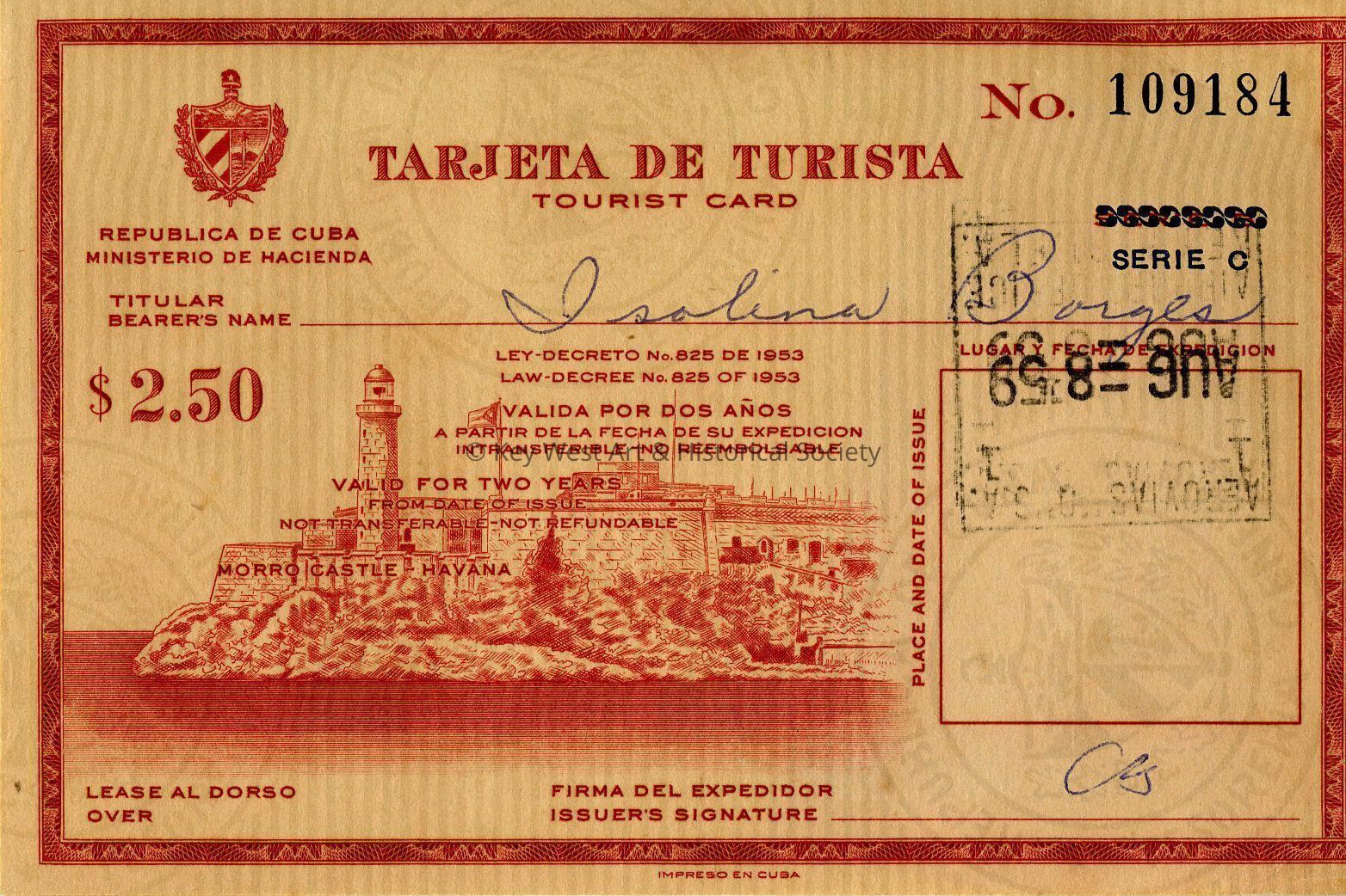 Cuban Tourist Card issued to Isolina Borges that is valid for two years from date of issue, August 8, 1959, allowing her to make unlimited visits to Cuba.  Card has red ink on yellow paper.Collection