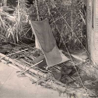 Cuban raft made of wood that has been held together by wire and cords. The sails are made of tobacco and manure bags.