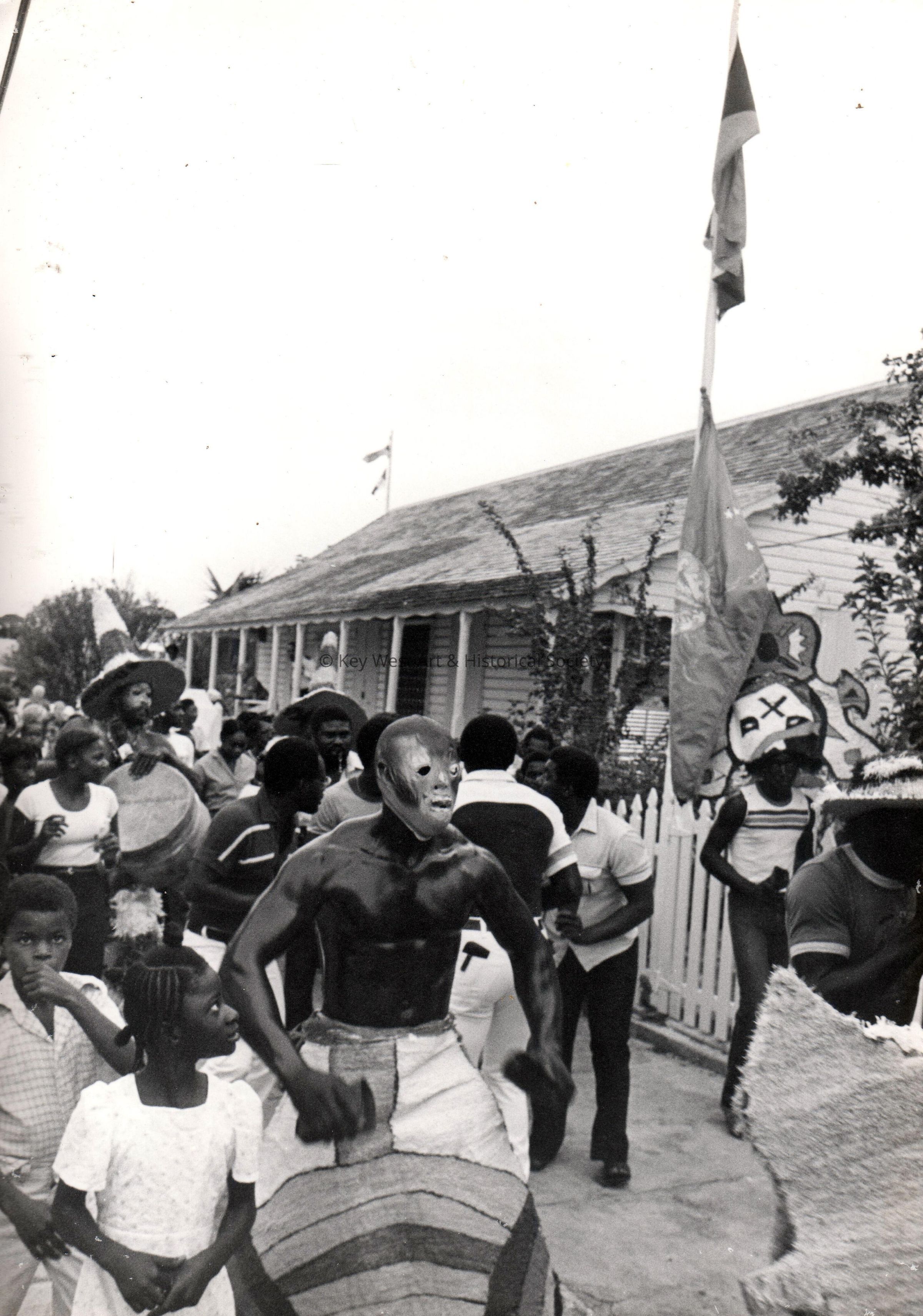 Black and white photograph of a junkanoo parade with dancers on the street at Green Turtle Cay.