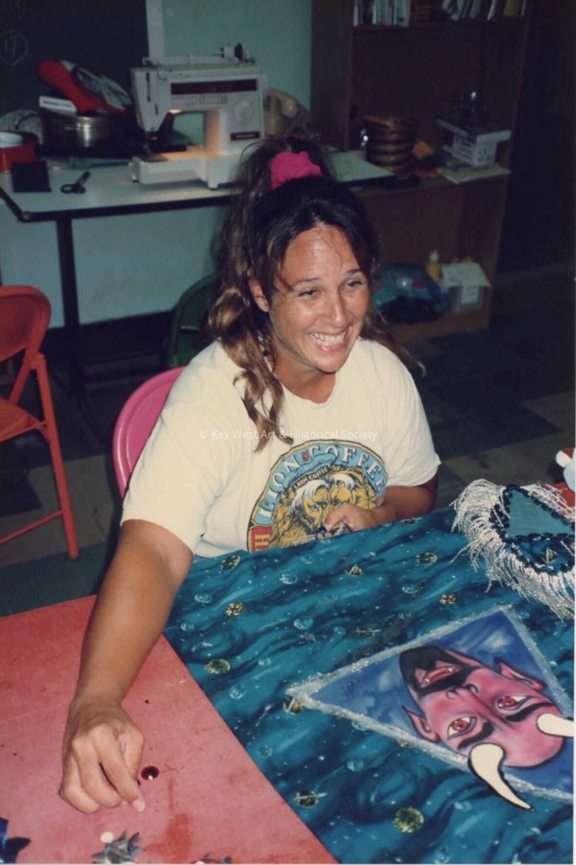 Unknown lady sitting at a table with a painting in front of her.Entry/Object ID