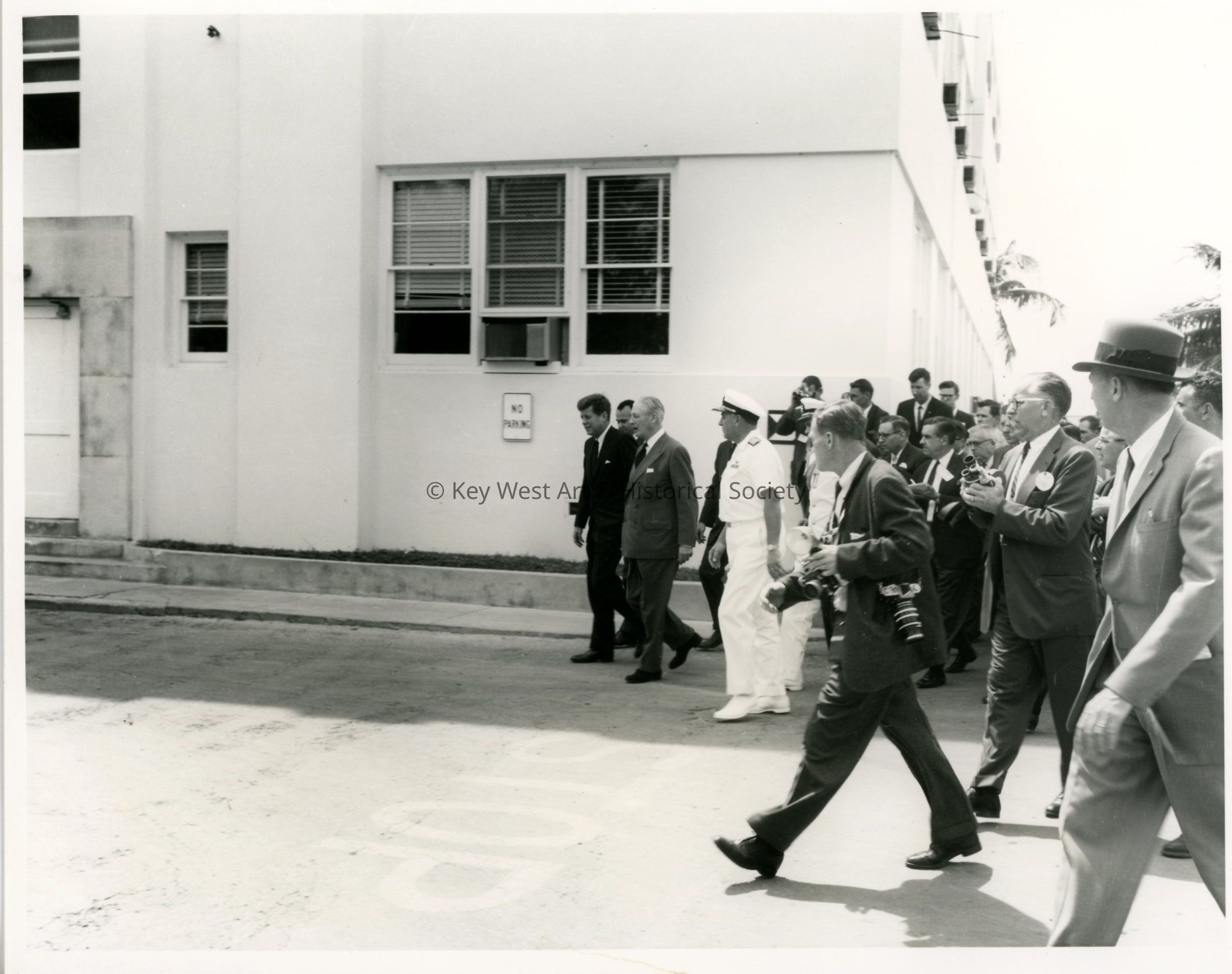 Black and white photograph of John F. Kennedy's visit to Key West to inspect military facilities in the wake of the Cuban Missile Crisis.