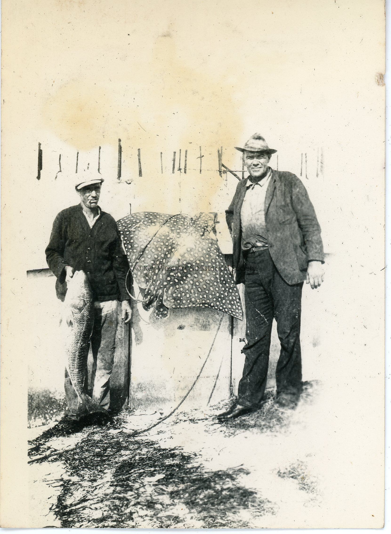Black and white photograph of two unknown men standing on either side of a spotted eagle stingray. The man on the left is holding a fish. The photo was part of a photograph album began by Victor H. Baker in 1940.