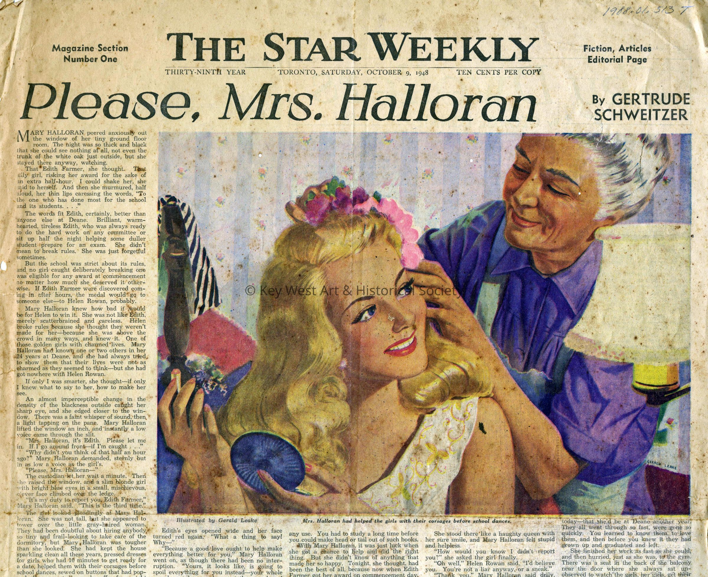 One page newspaper serial story entitled 'Please, Mrs. Halloran' written by Gertrude Schweitzer and illustrated by Gerald Leake. The serial appeared in The Star Weekly newspaper based in Toronto, Canada.Collection