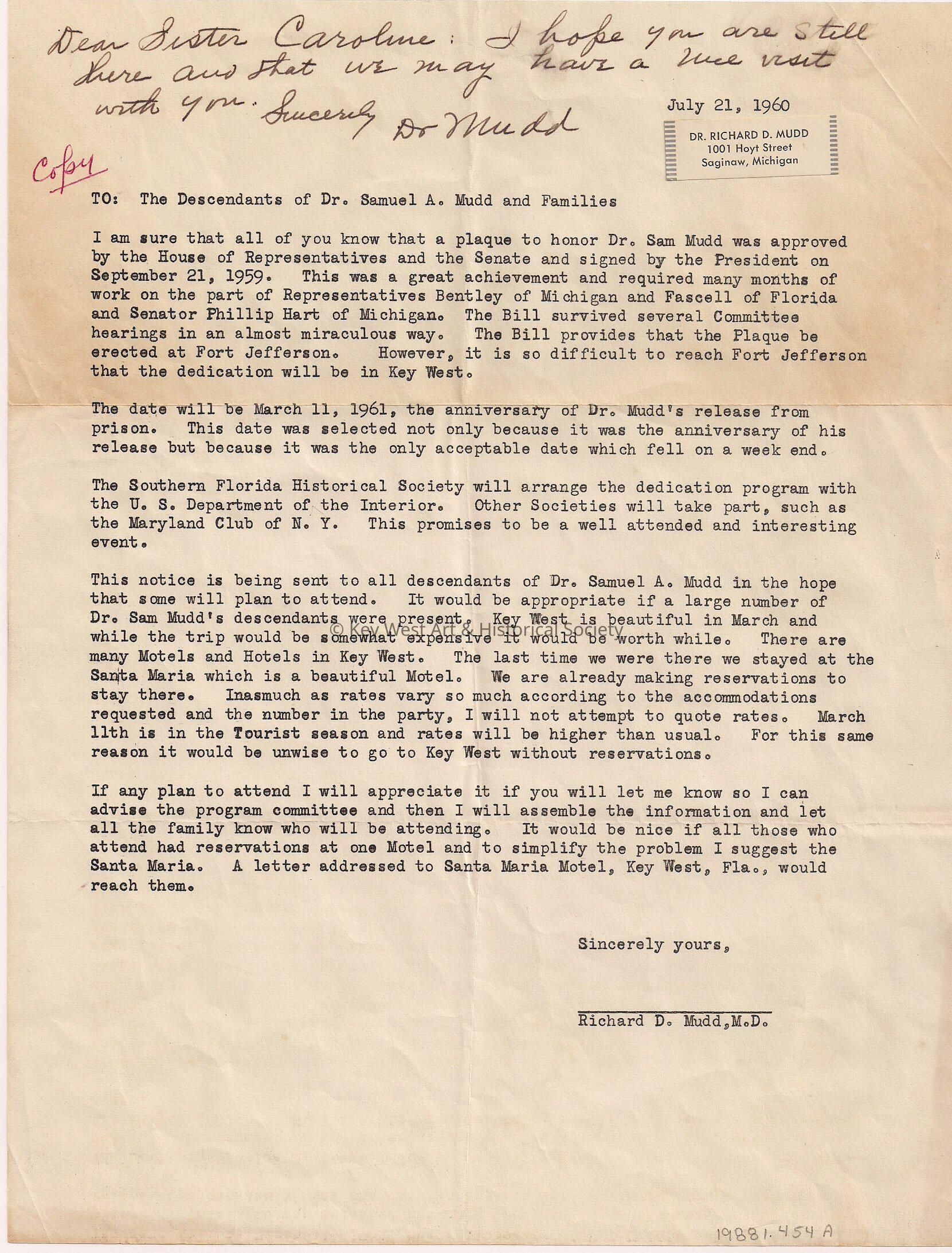 Typed letter to the descendants of Dr. Samuel Mudd and Sister Marie Caroline of the Convent, informing them of a plaque dedication in honor of Dr. Samuel Mudd.