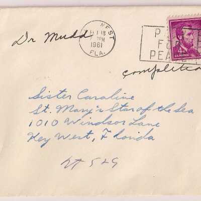 Invitation to the plaque dedication ceremony for Dr. Samuel Mudd. Invitation is addressed to Sister Caroline at St. Mary's Star of the Sea.