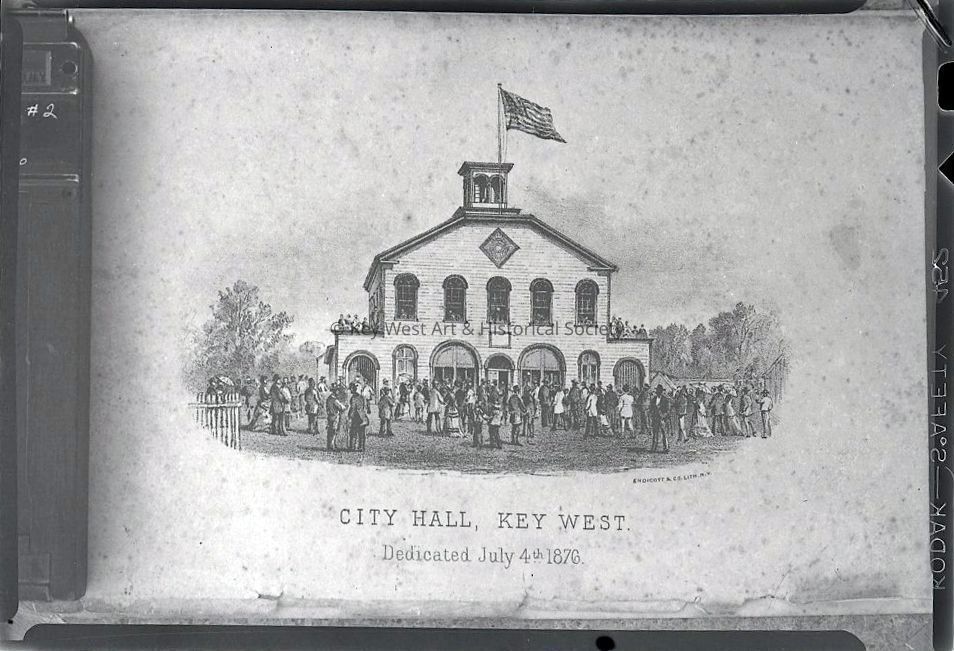 Black and white photographic negative depicting the original Key West City Hall on Greene Street, dedicated on July 4, 1876.Photograph Details