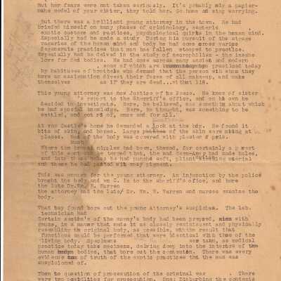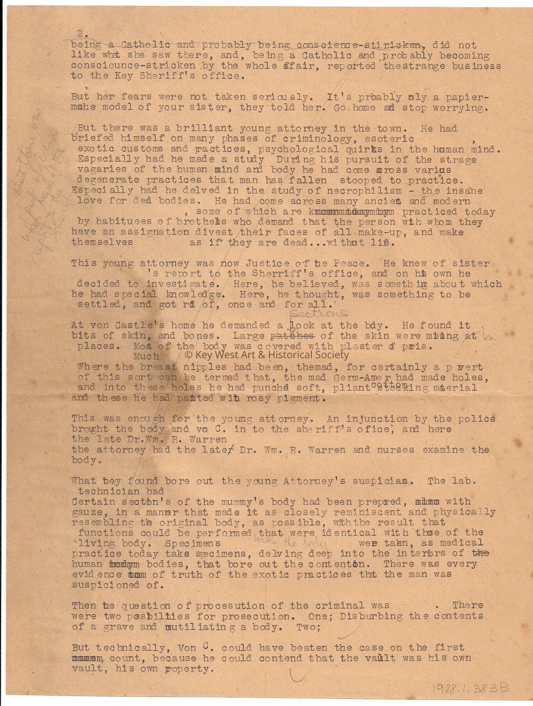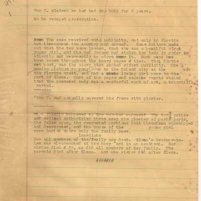 Three typed pages on the story of Carl Tanzler, also known as Count Von Cosel, and Elena de Hoyos. From Judge Enrique Esquinaldo.Collection