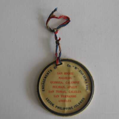 Plastic pin that reads "Co. M 51st Iowa" "Welcome home Red Oak, IA". There is a picture of the company on the front. The back reads "Engagements of Co. "M" Iowa Vol."Collection