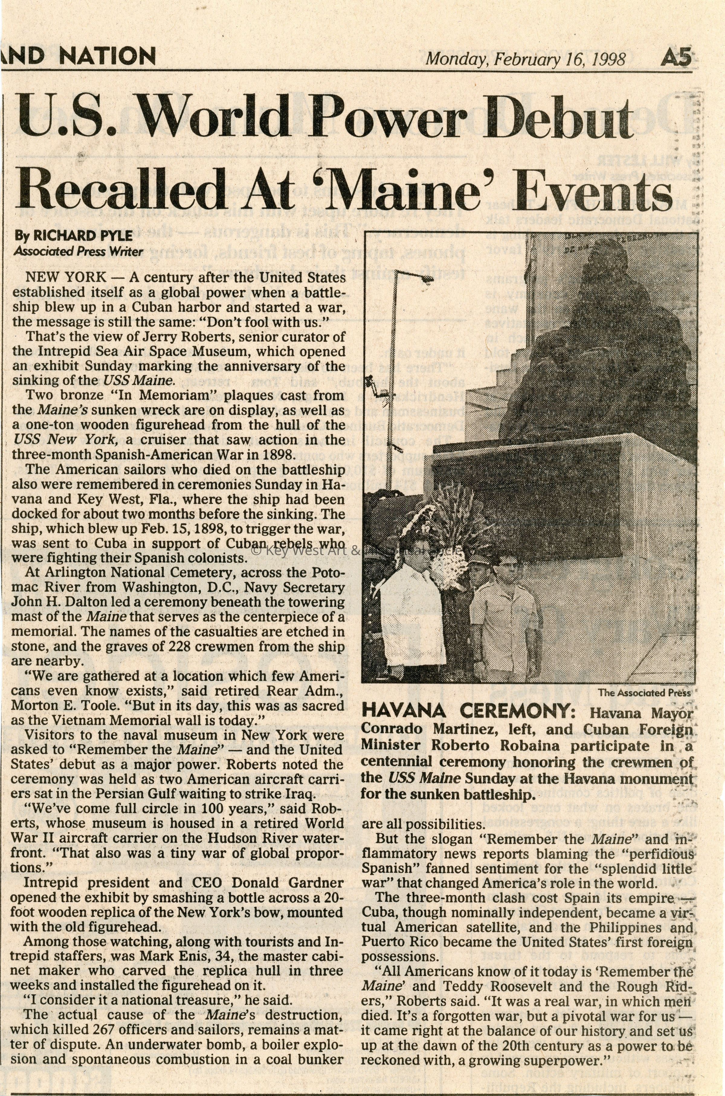 Newspaper clipping from the Chattanooga Free Press with a black and white image of the Mayor of Havana, Conrado Martinez (left) and the Cuban Foreign Minister, Roberto Robaina (right) at the centennial anniversary ceremony for the sinking of the USS MAINE in Havana. The article discusses the military and political impacts the sinking of the MAINE had on the United States and Spain.Collection