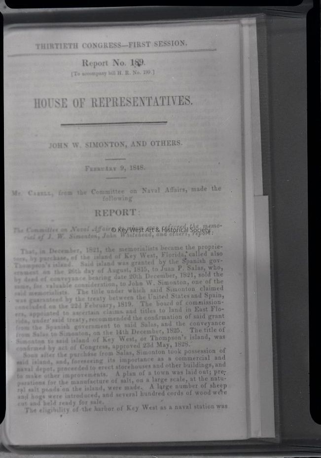 Photographic negative depicting the U.S. House of Representatives Report on the purchase of Thompson's Island (also known as Key West) by John W. Simonton and others.