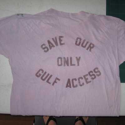 Purple t-shirt that reads (front) "Save our S.O.S. Shoreline" (back) "Save Our Only Gulf Access."Collection
