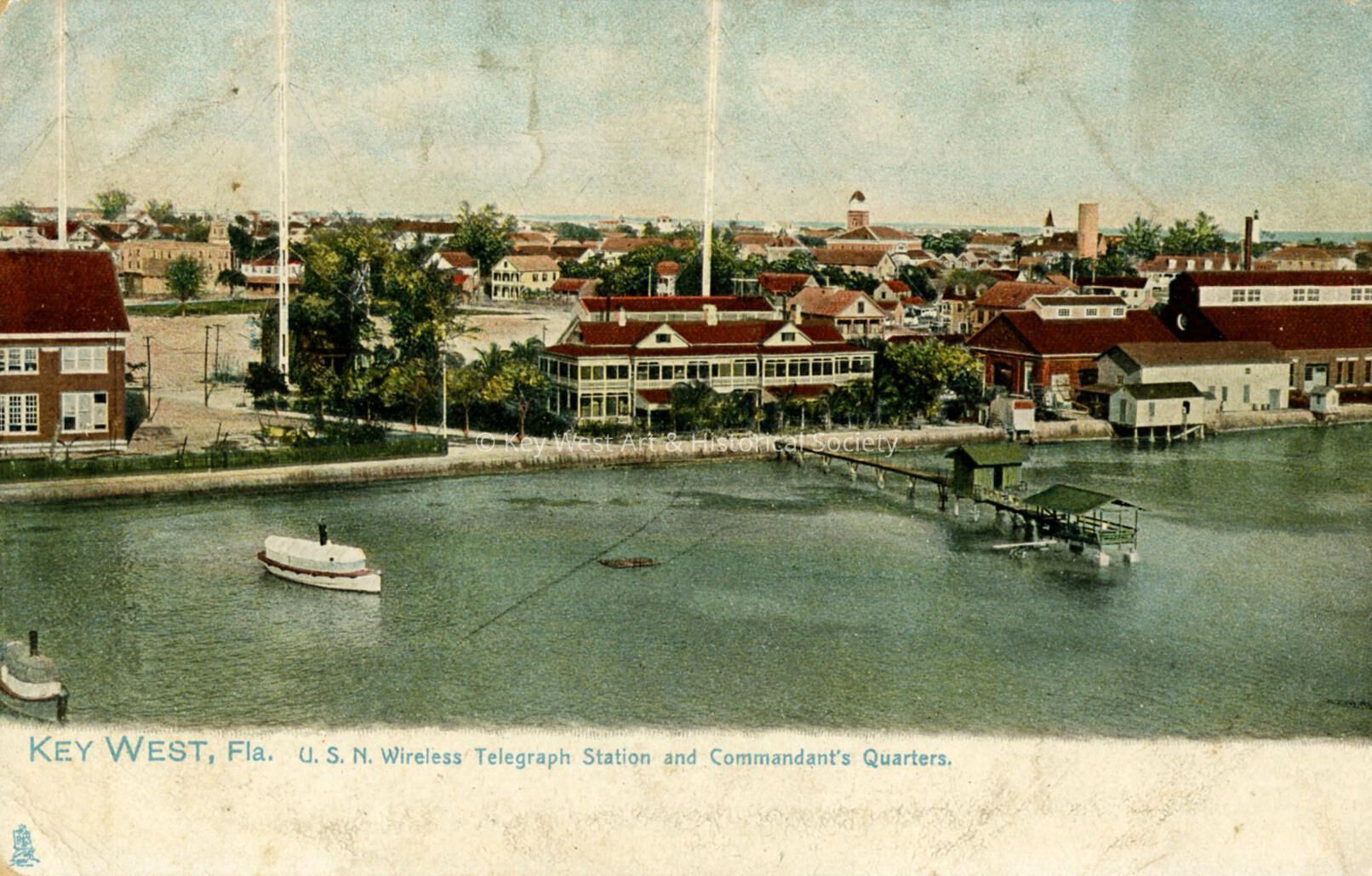 Postcard depicting a view of the Wireless Telegraph Station taken from the water. The Little White House is on the waterfront in the center of the image. The caption reads, 'U.S.N. Wireless Telegraph Station and Commandant's Quarters.' Notation on verso, 'The Wireless Telegraph Station was erected by De Forest in 1895, and is in daily communication with Pensacola, Cuba, Porto Rico, and Panama, and frequently with many northern cities. The U.S. Naval Commandant's Quarters were erected in 1890, at a cost of about $15,000; they front on the harbor.'Subject Person/Organization