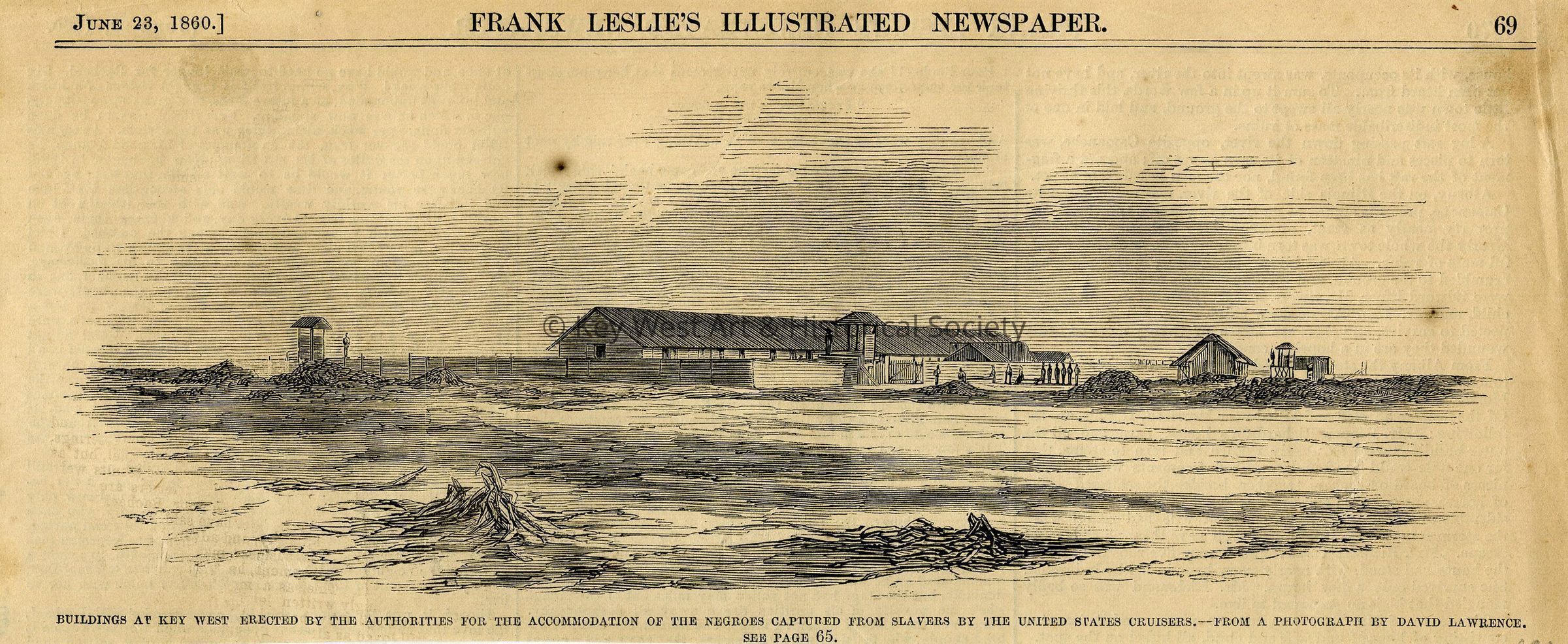 Lithograph clipping from Frank Leslie's Illustrated Newspaper dated June 23, 1860. Illustration depicts the buildings erected by authorities for the accommodation of the Negroes captured from slavers by the United States cruisers during the Civil War.