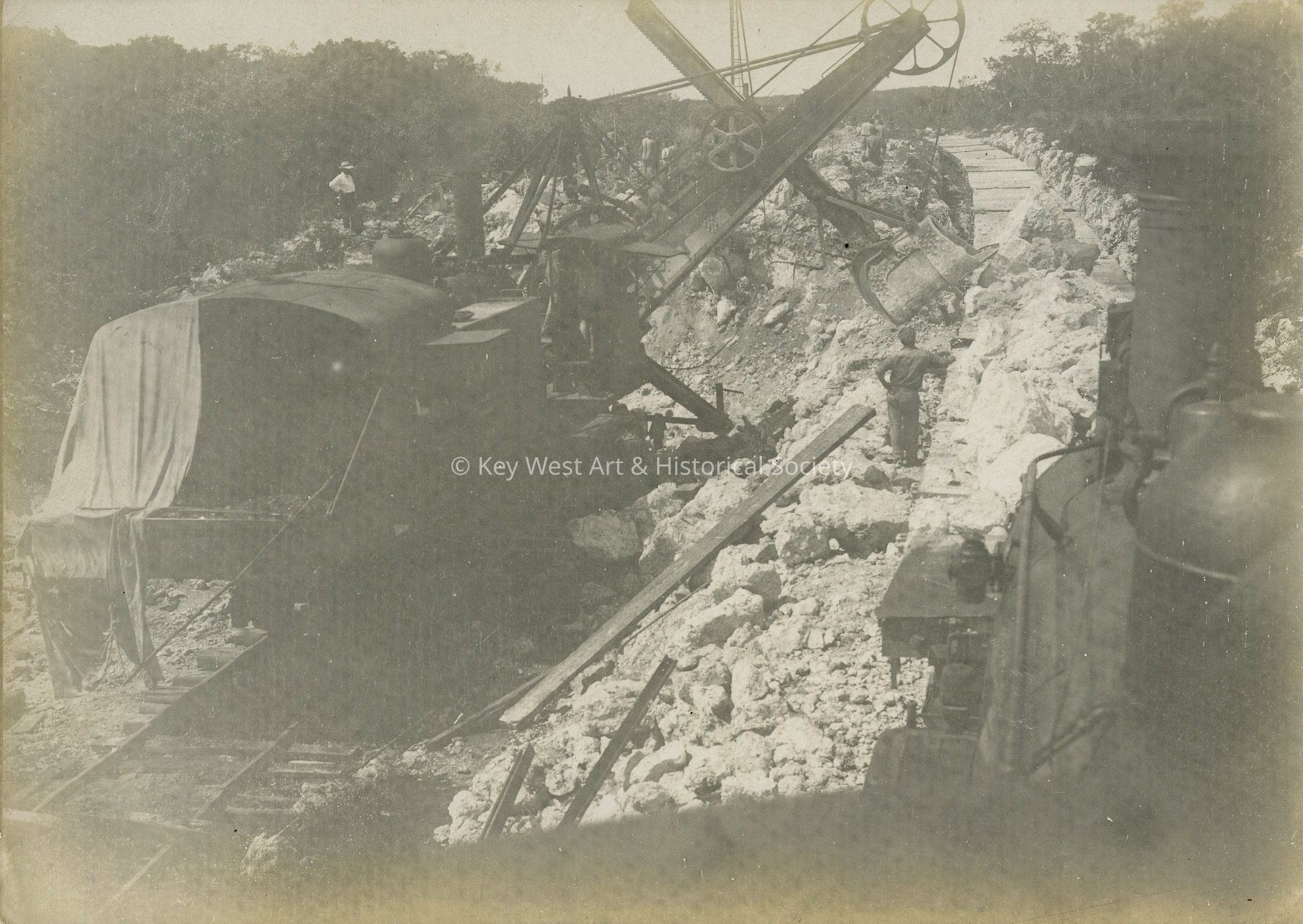 Black and white photograph depicting the construction of the Oversea Railway. Construction workers are using an excavator to move large pieces of coral rock.