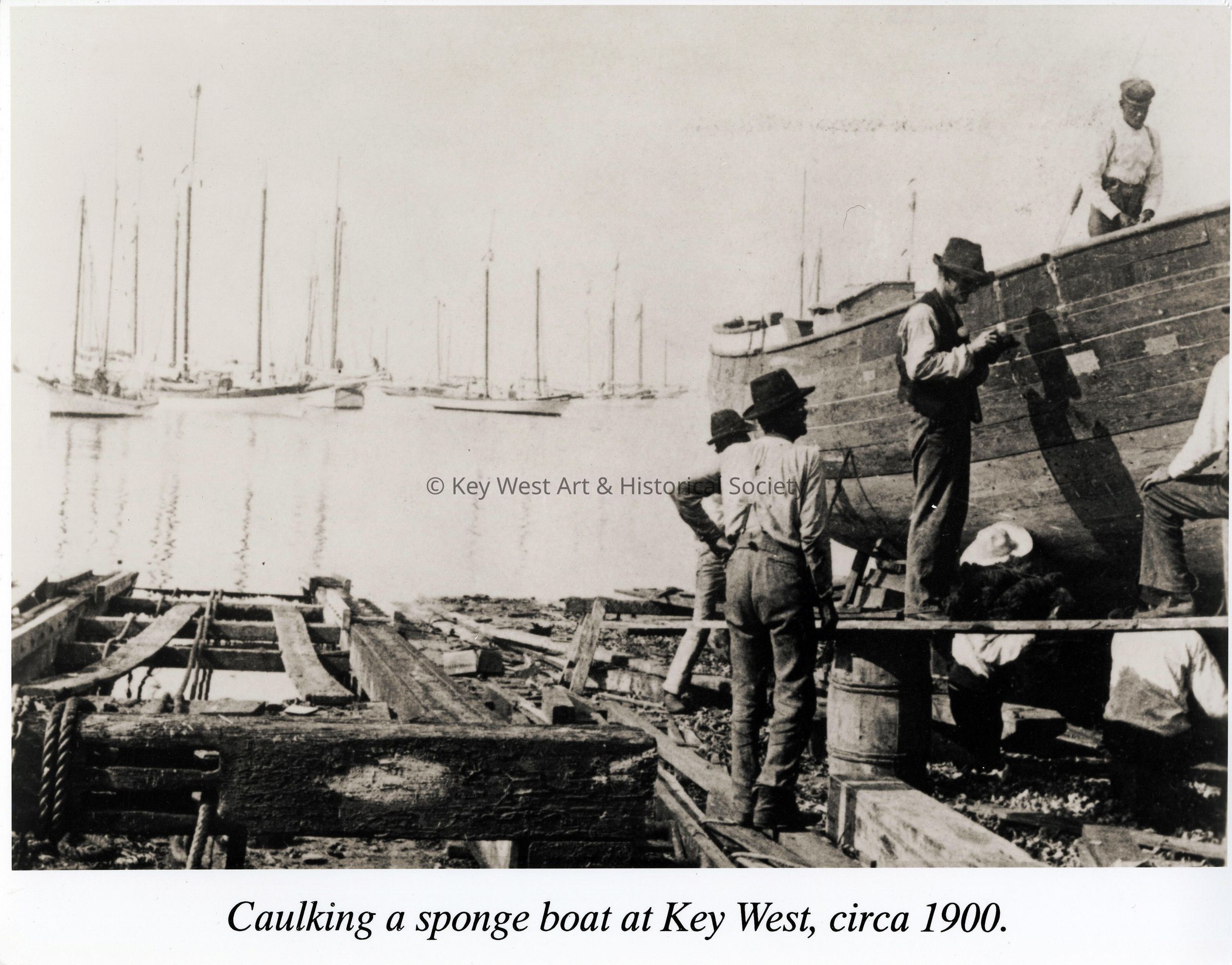 Black and white photograph of carpenters caulking a sponge boat at Key West Bight.