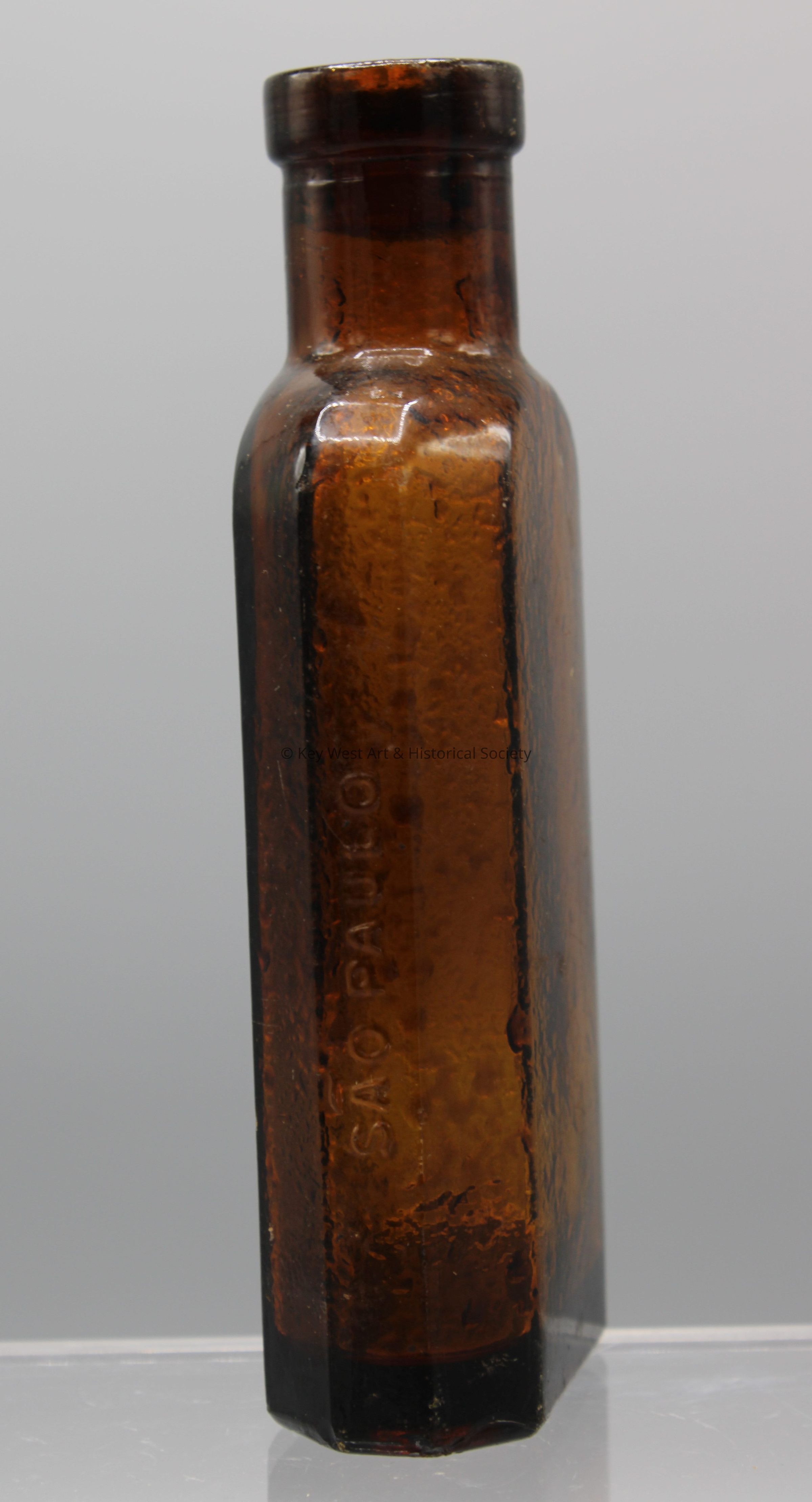 Brown glass medicine bottle that has 'Laboratorio Hepacholan' on one thin side and 'São Paulo' on the other. The cork is still in place.Collection