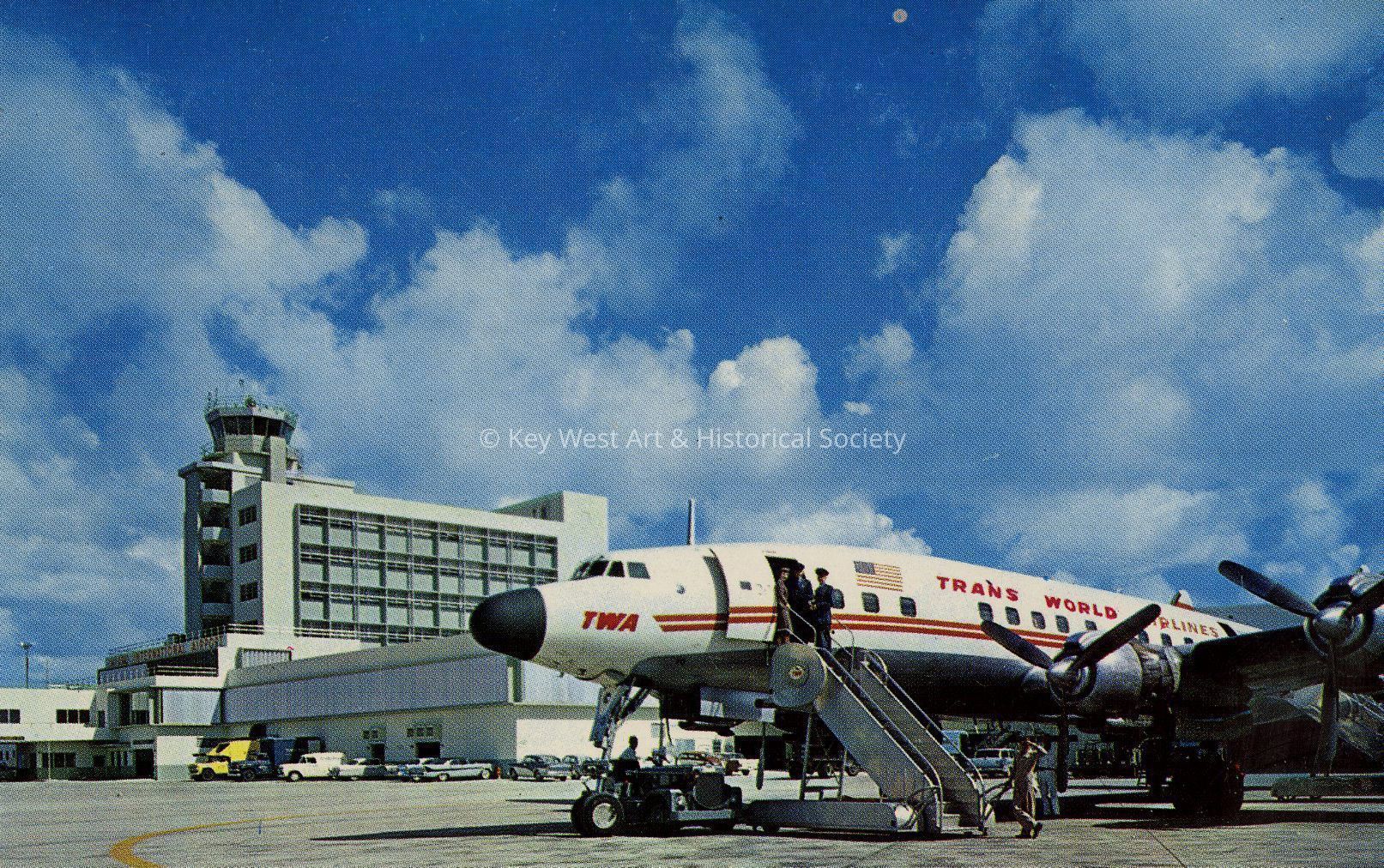 Postcard depicting a Trans World Airlines (TWA) plane at Miami Airport.  Notation on verso, 'Miami, Florida.  The new terminal building and one of the passenger planes which make Miami International Airport one of the nation's largest and busiest.'Subject Place