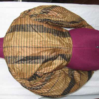 Brown and black taffeta blouse or jacket. Long sleeves. Hook and eye front closure. Fitted waist.