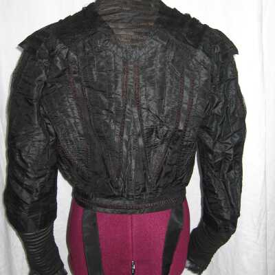 Black taffeta blouse. Neck and sleeves are trimmed with lace. 2 garters in back to attach the blouse to the skirt in order to keep blouse tucked in.