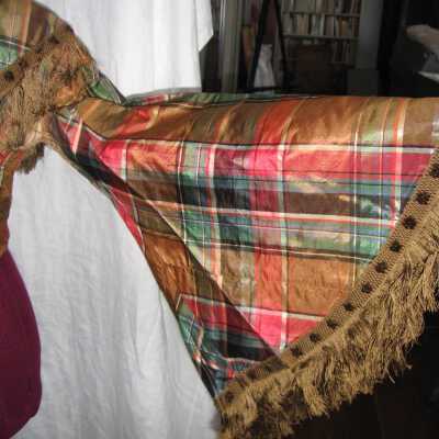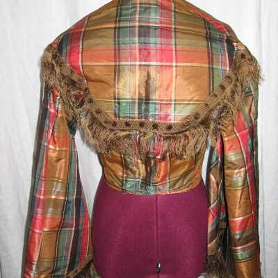 Taffeta plaid high waist jacket or blouse. Hook and eye front closure. Bell sleeves. Fringe trim on sleeves and collar.