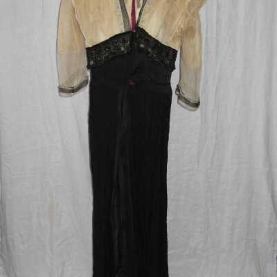 Evening dress. Empire waist. Waist and below is black silk. Waist line has black beads sewn around it. Bodice is made of layers of lace. Inside lining is satin or silk. Three quarter lace sleeves with black lace trim on the bottom. High neck.
