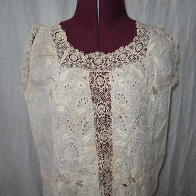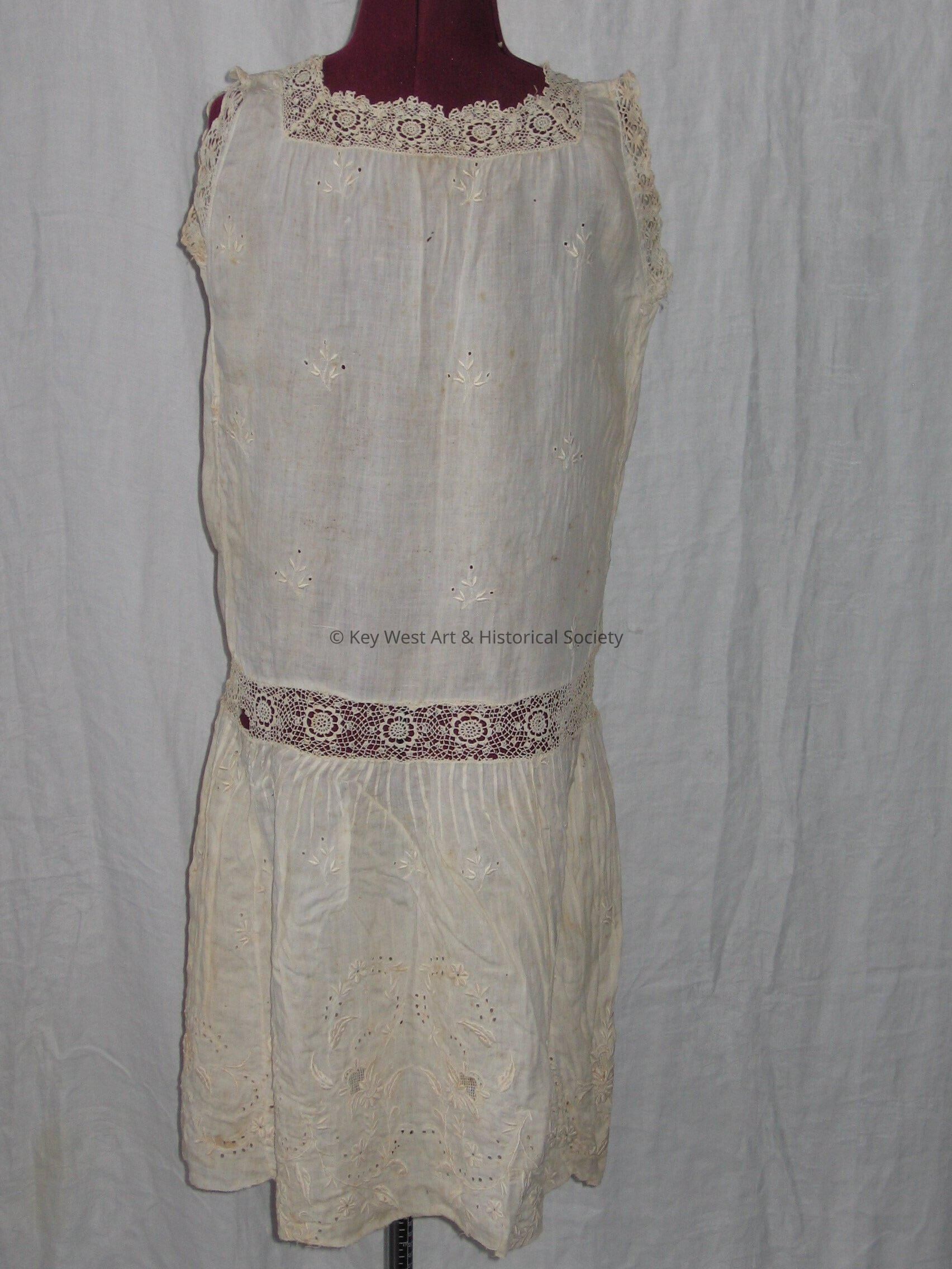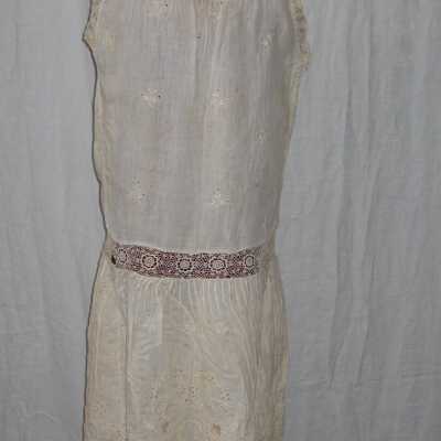 White chemise with a rounded neck. Neck and arm holes have scalloped edges. The fabric has a floral pattern.
