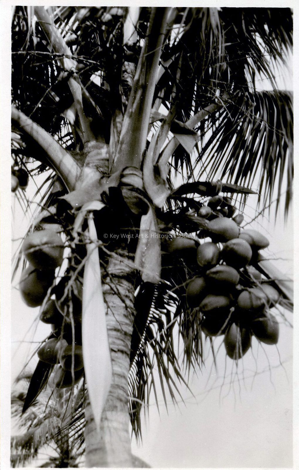 Photograph postcard depicting a cluster of coconuts in a coconut palm tree.