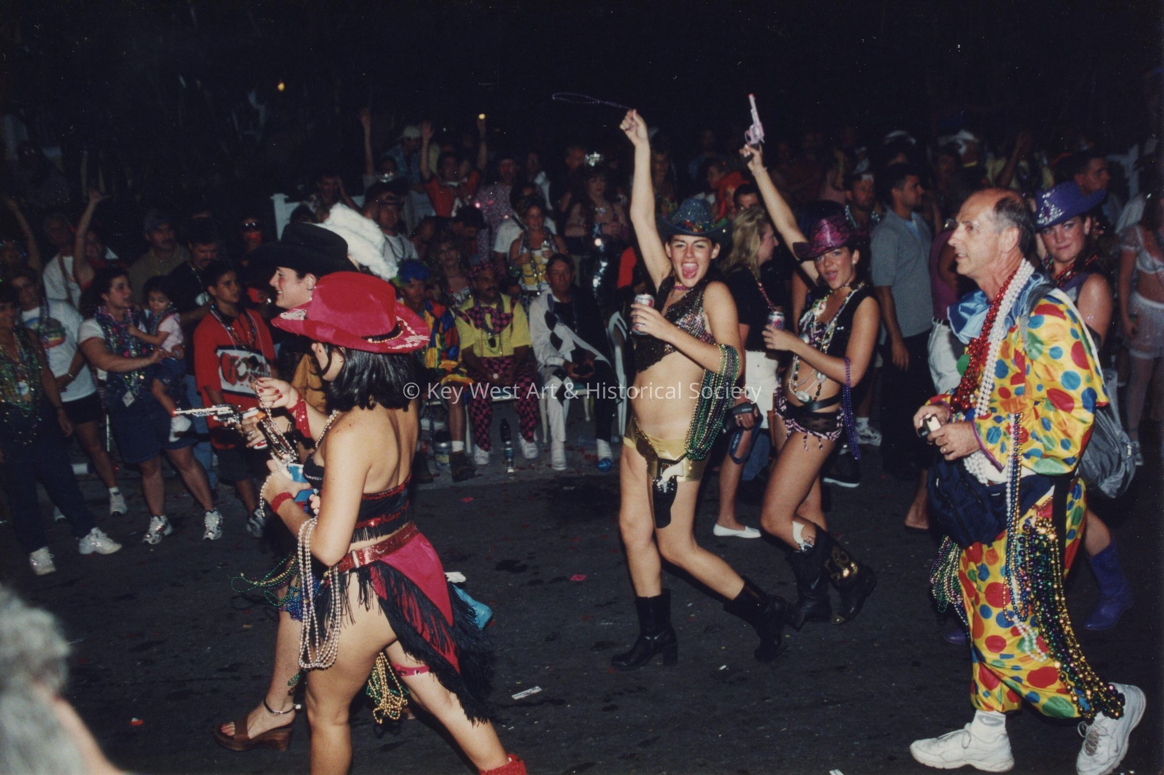 Unknown people dressed up dancing on the street for the parade.Entry/Object ID