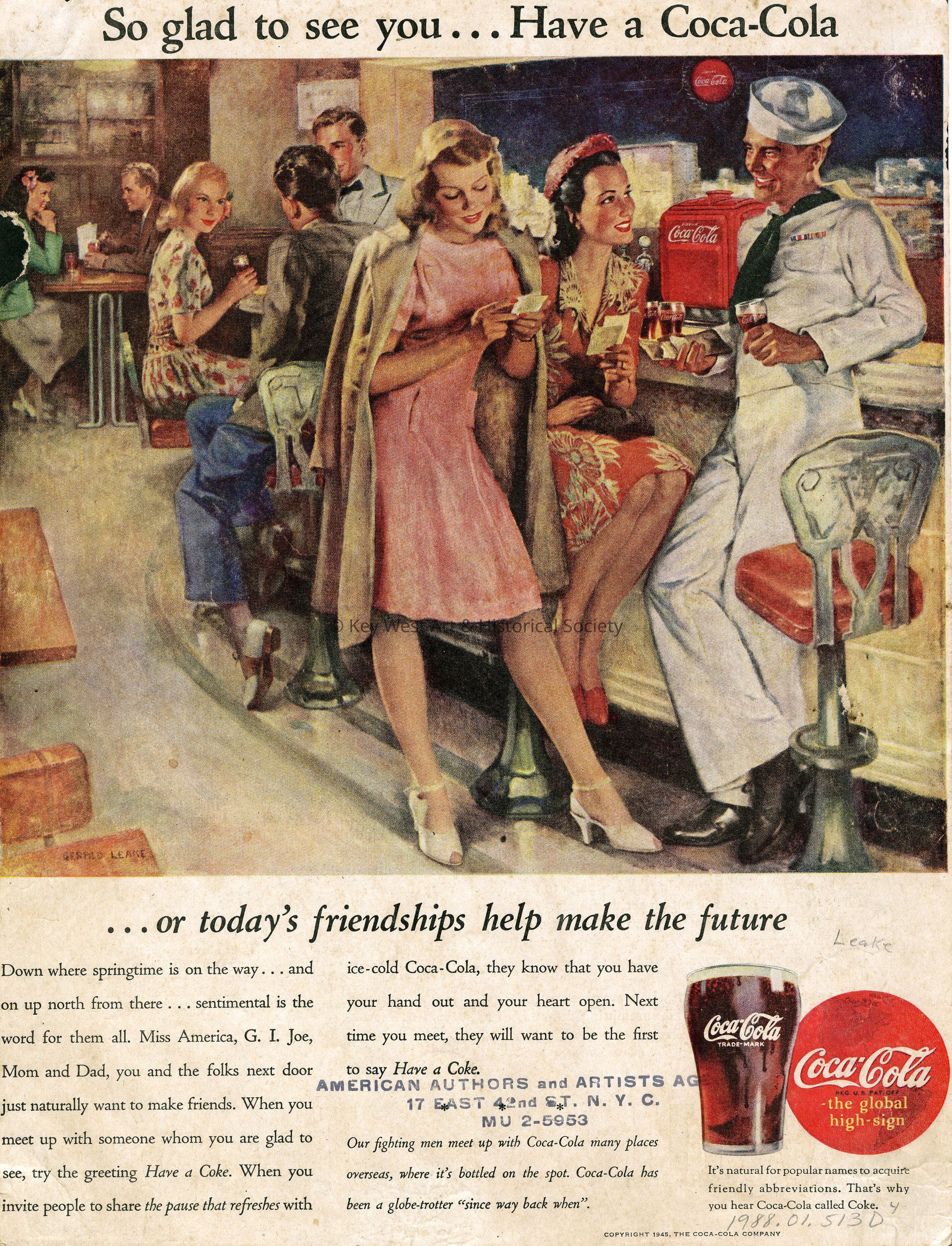 Illustration by Gerald Leake for a Coca-Cola Company advertisement. The illustration depicts two young ladies and a young Navy sailor at a soda bar.
