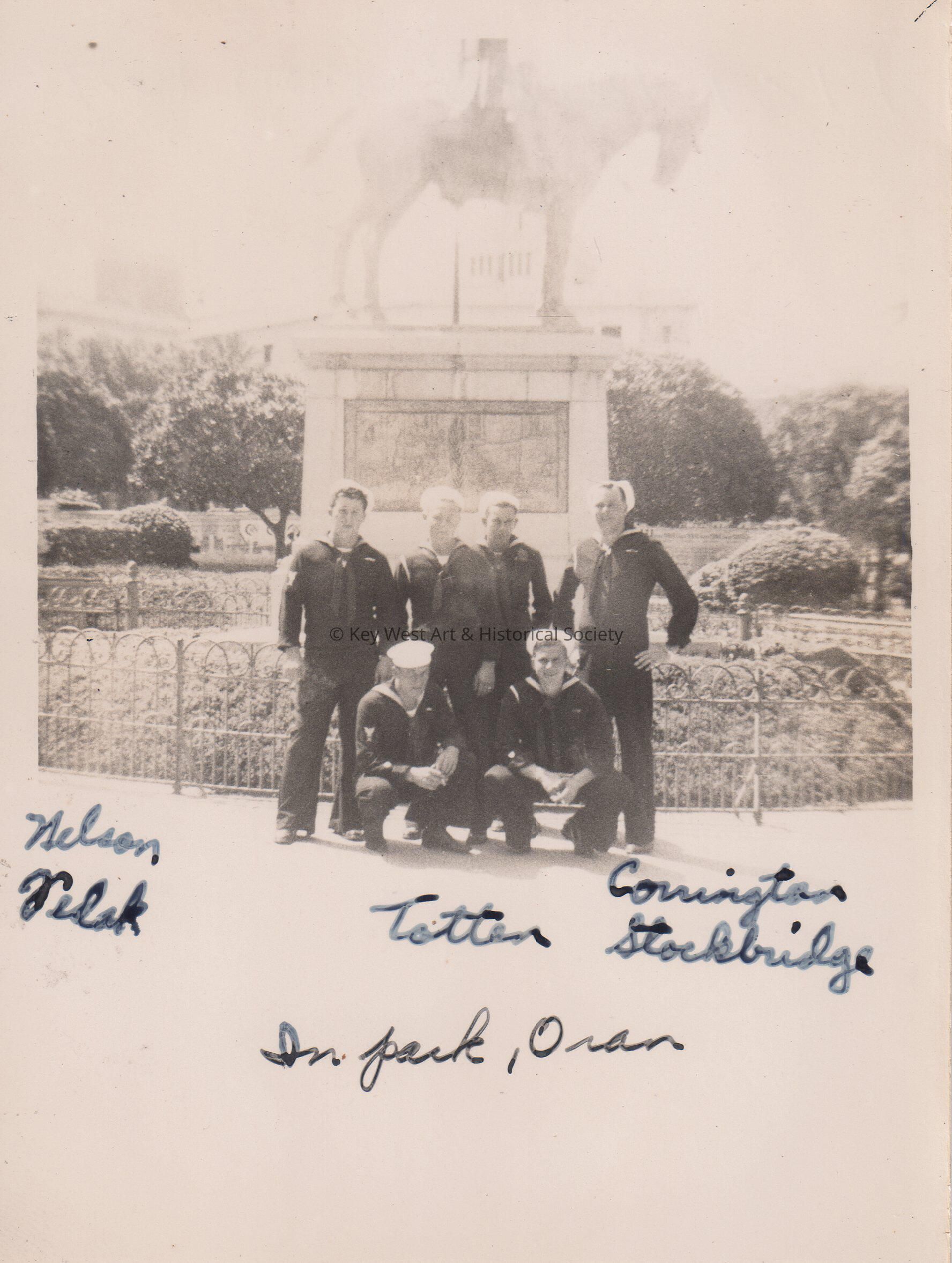 Sailors from the U.S.S. Key West (PF-17) in World War II; Nelson, Pedak, Totten, Covington, and Stockbridge in front of horse statue in a park in Oran.Collection