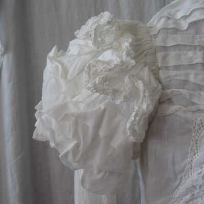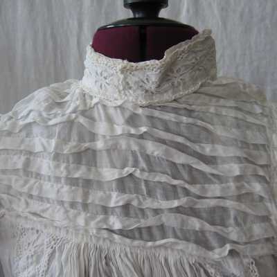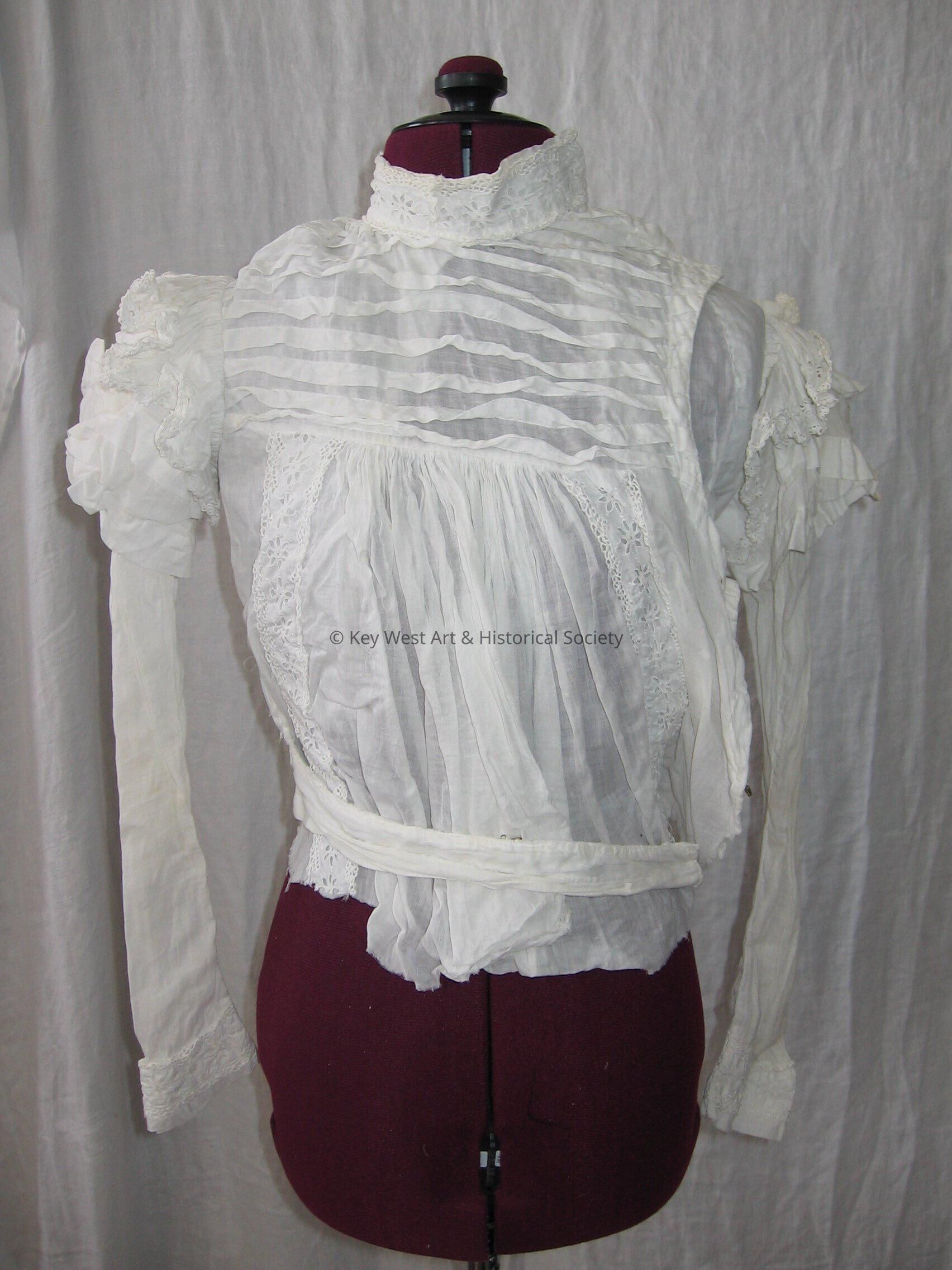 White long sleeve linen blouse with a high collar and puffy shoulders. Embroidered trim on collar and sleeves as well as inset into the bodice of the blouse.