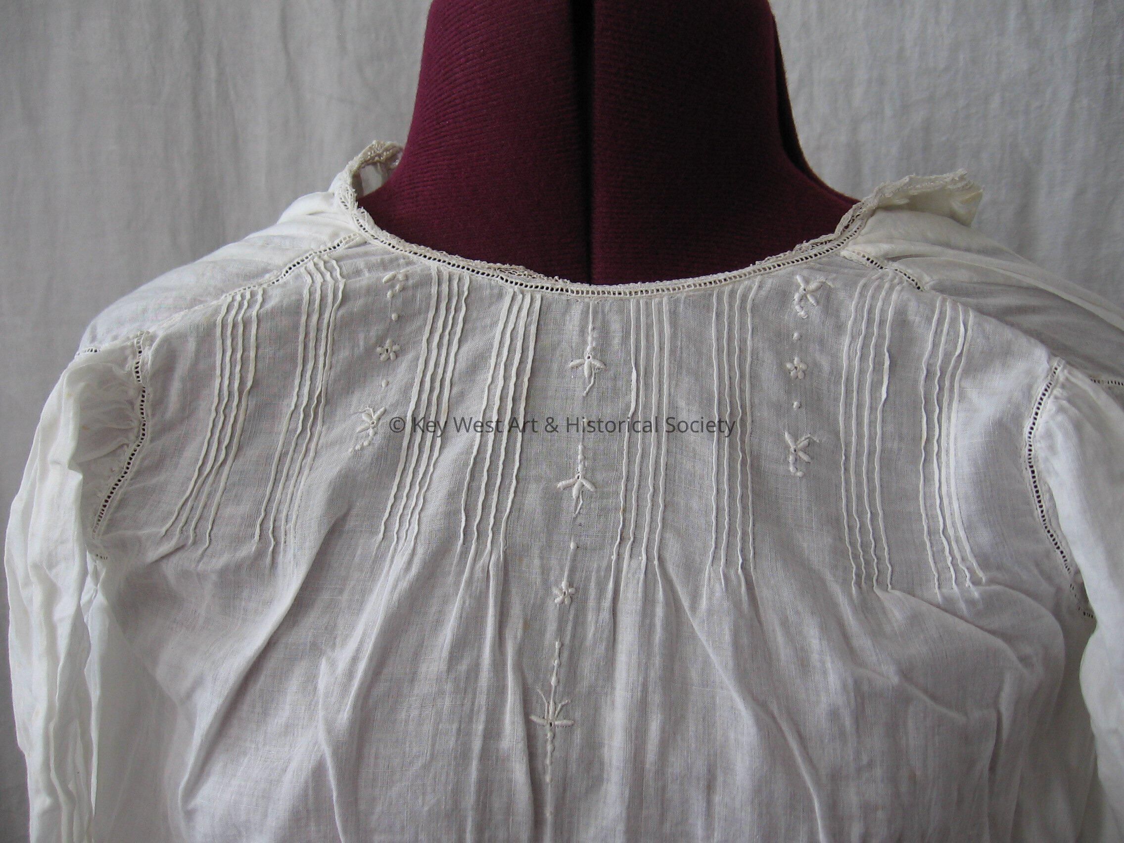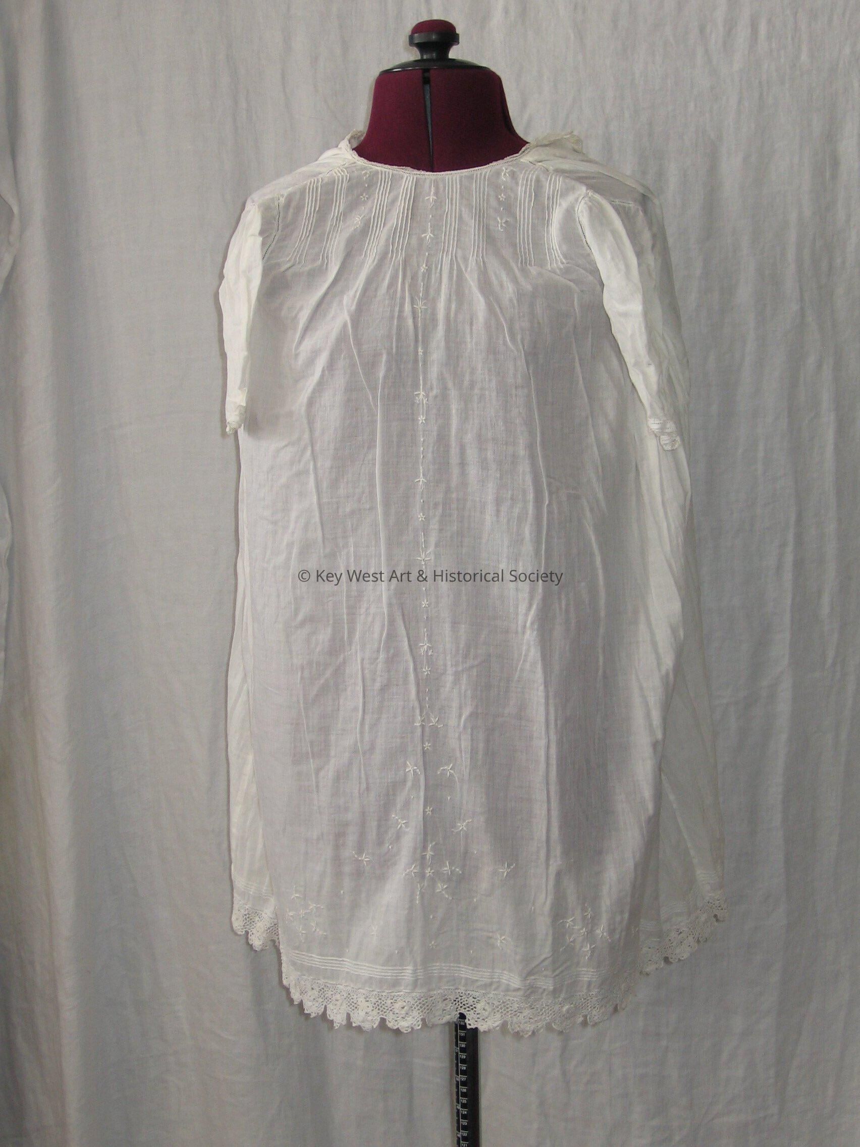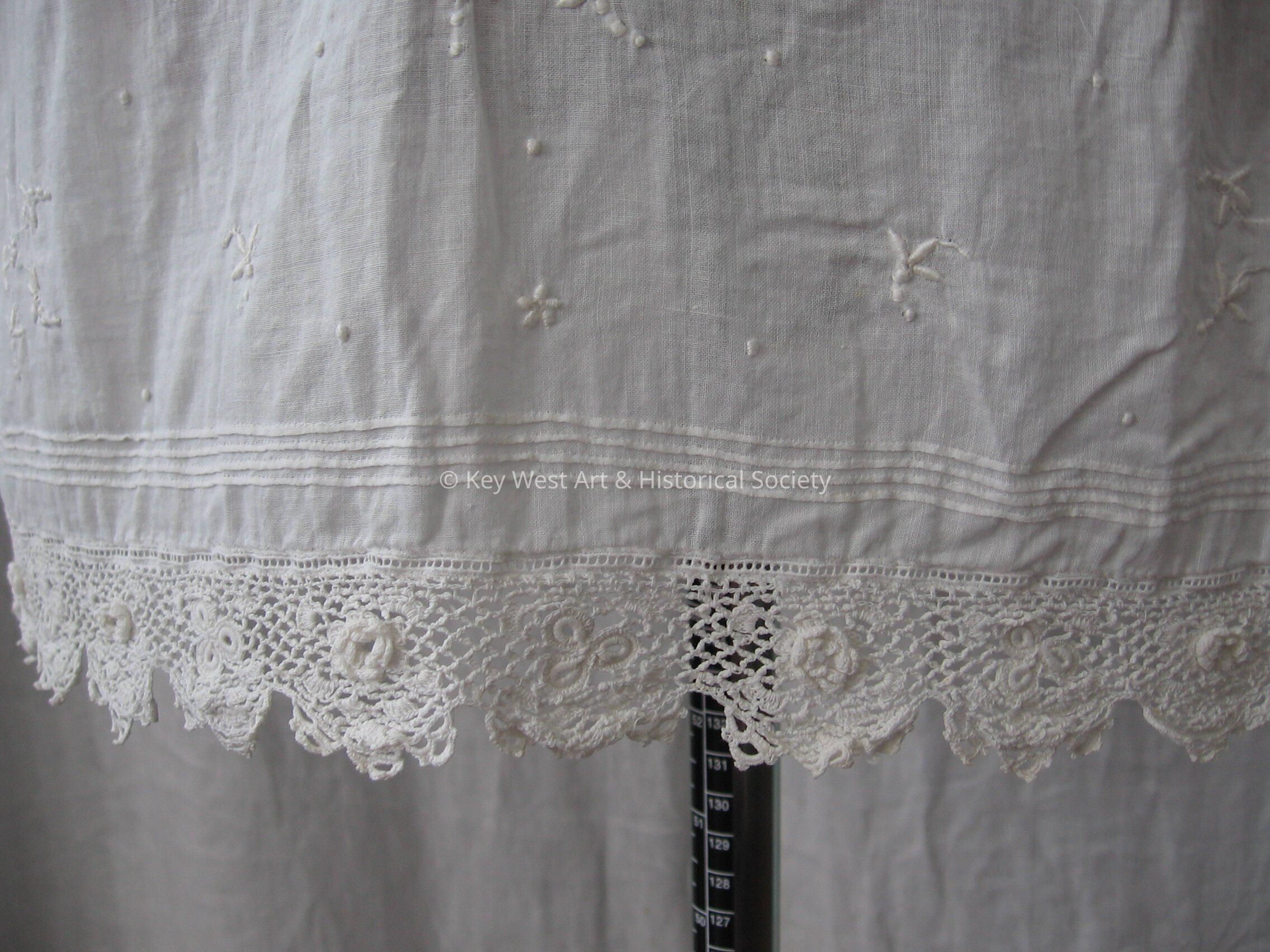 White infant baptismal gown. Lace trimming on hem, sleeves, and neck. Embroidered stitching on front of gown.