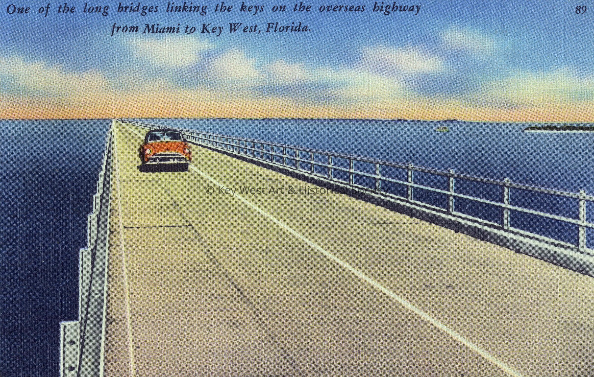 Postcard of a car traveling on a bridge of the Overseas Highway. The caption reads, ‘One of the Long Bridges Linking the Keys on the Overseas Highway from Miami to Key West, Florida.'Collection
