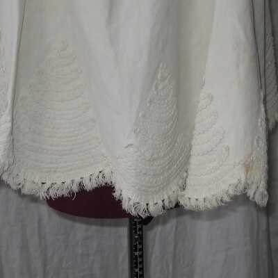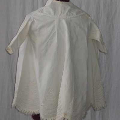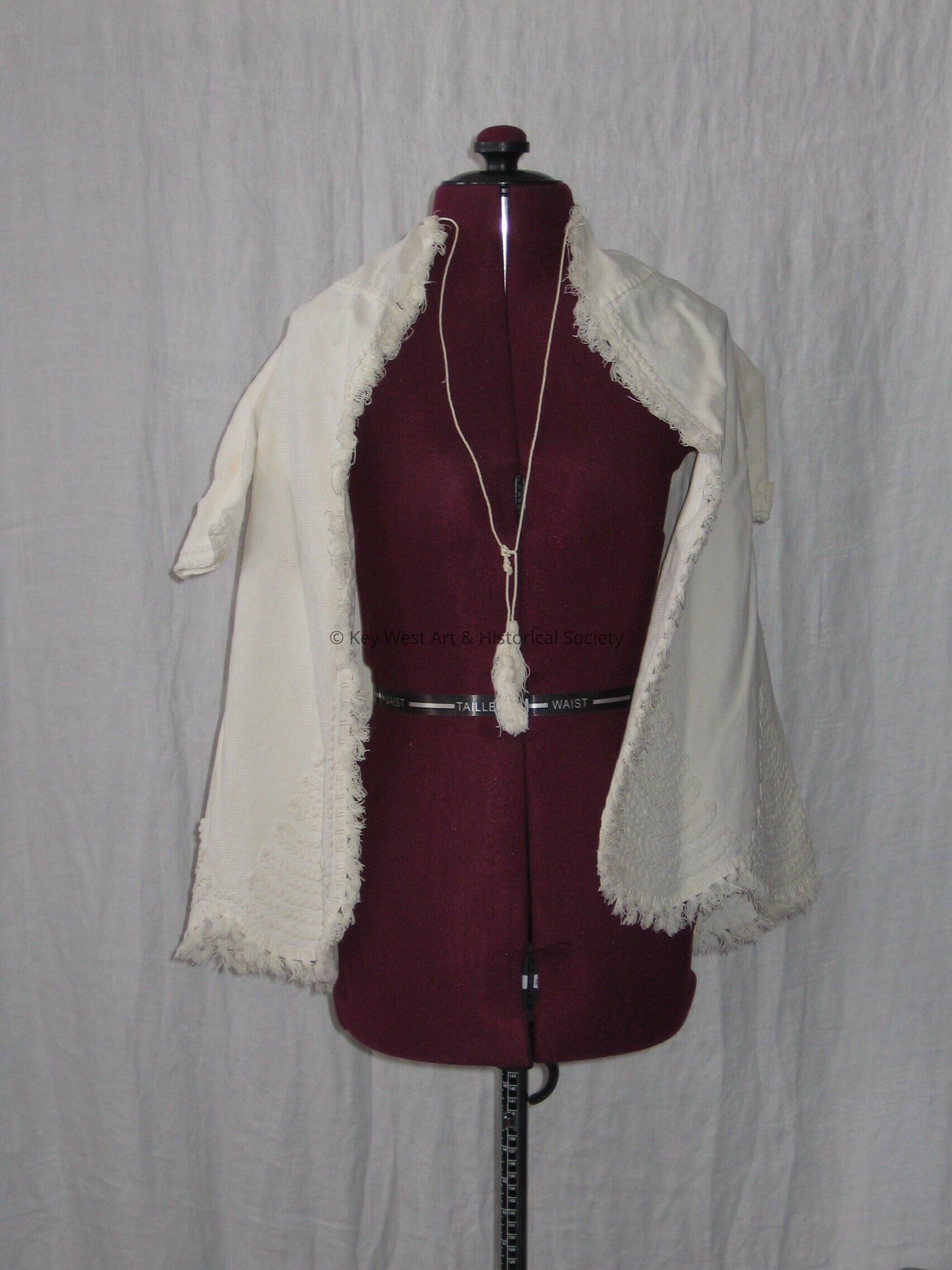 White coat with a quilted pattern. Fringe trim. Embroidered design on bodice.