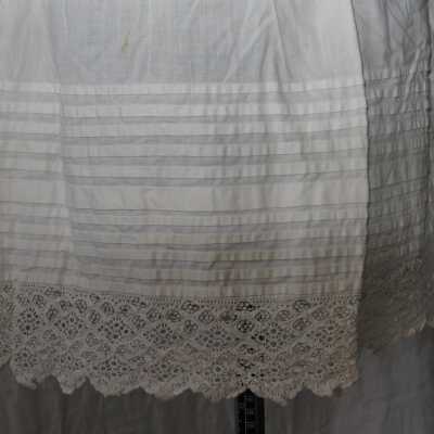 White cotton slip for a child. Button closure. Embroidered lace on trim and horizontal pleating on the lower half.