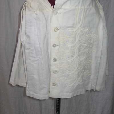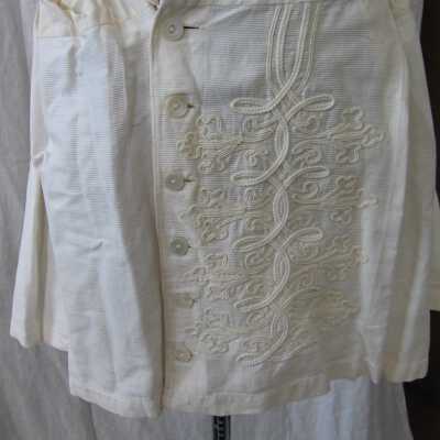 White pleated cotton skirt with button closure and an embroidered design by the button closure.