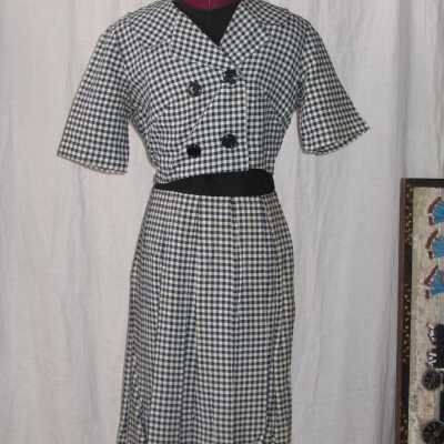Double breasted jacket with four buttons and a wide collar. The jacket has a black and white checkered pattern. Goes with a matching dress.
