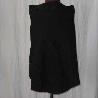 Black shawl or wrap with an embroidered floral and leaf pattern on the back.