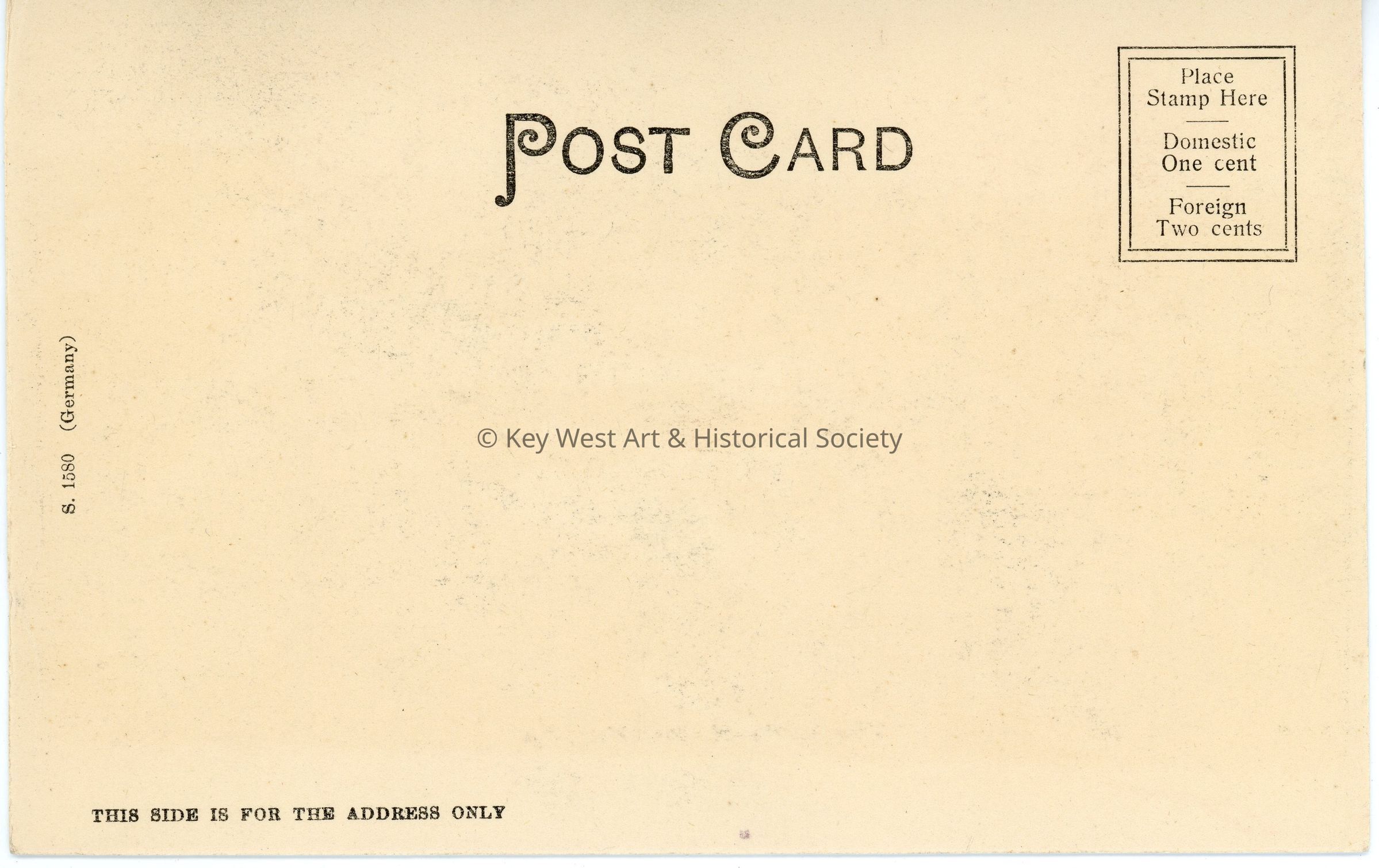Postcard with a black and white image of the "View Northeast. Key West, Fla." In the foreground are homes and vegetation and in the background is coastline.Subject Place