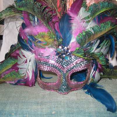 Purple and teal sequin masquerade style mask. Purple, teal, and blue peacock feathers on top of mask. Beaded broach on forehead.Collection